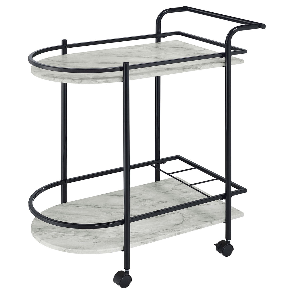Invite guests over for an intimate soiree and serve up cocktails on this contemporary bar cart. Classic faux white marble shelves stack on top of one another, lending a traditional approach to its sleek modern silhouette. Rounded edges on one side add to the graceful appeal of the elongated shape. Designed in a metal frame with slim railing all around to keep bottles in place, this bar cart is ready to glide across floors. Lockable rolling casters secure it in place.