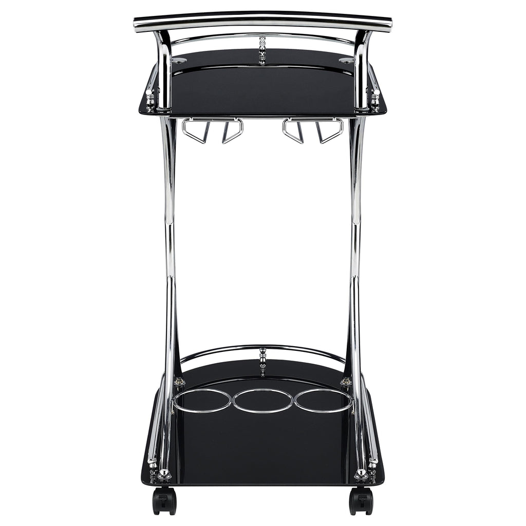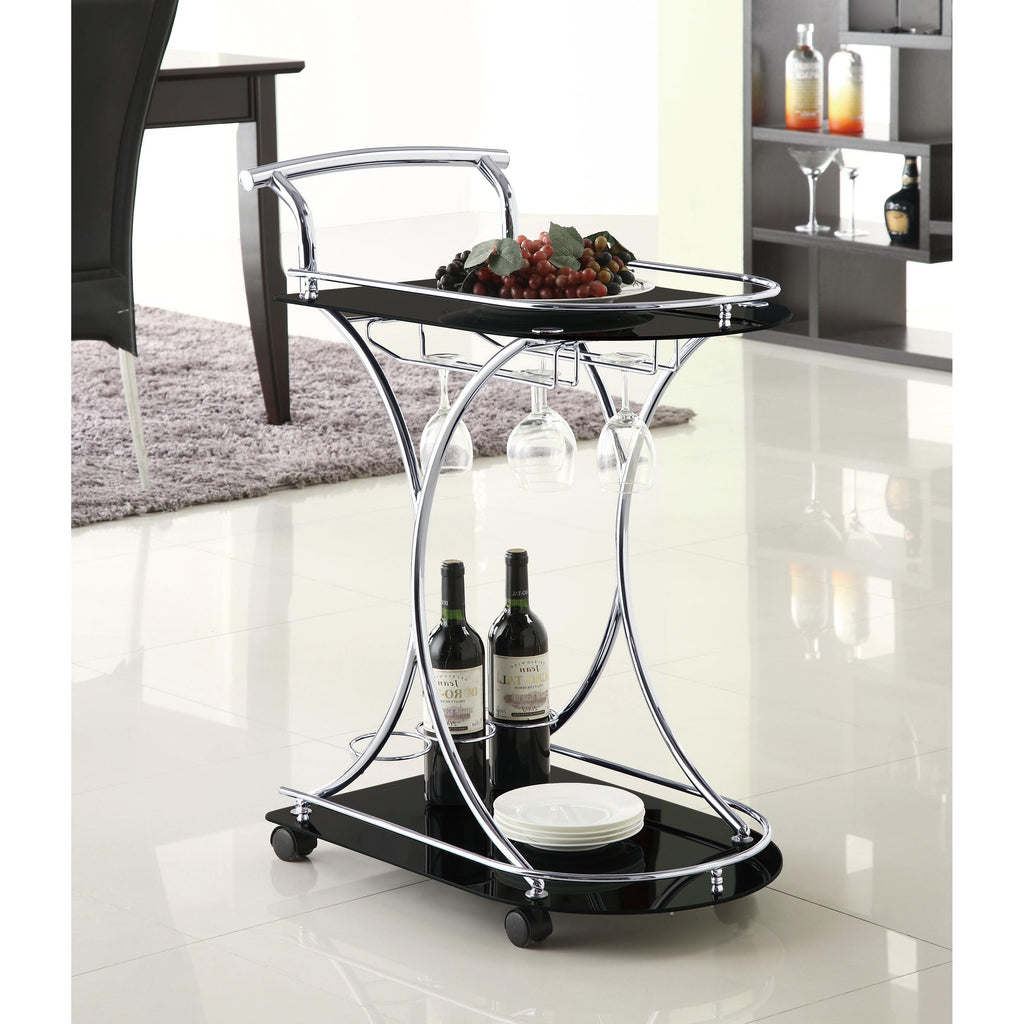 Recapture mid-century elegance with an enticing function. Slender construction elements form a graceful look in this mobile serving cart and add a lovely accent piece that's also useful for entertaining. Sleek black glass serves as a top and bottom shelf, contributing to an upscale flavor. Chrome finish metal accents round out a luscious palette. Serve and store with a pair of wine bottle holders and a stemware rack.