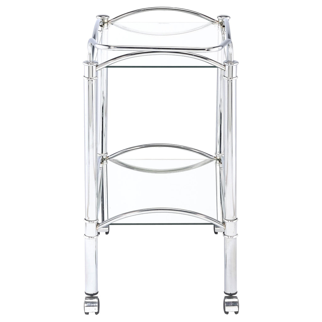 Simple elegance with a modern twist. This freshly styled serving cart offers a tasteful addition to contemporary decor. With a sleek chrome finish, its metal frame receives romantic curved accents. A tempered glass top shelf and mirrored bottom shelf accommodate beverages, food, and implements. Casters allow mobility to work the room easily.