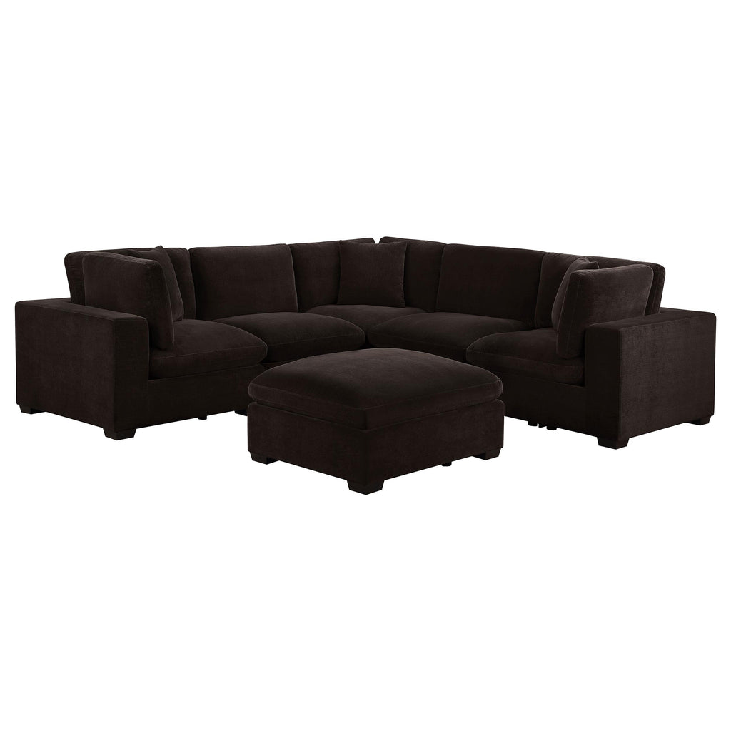 Sink into comfort with a modern, modular sectional sofa with an included ottoman. Plush cushions create exceptional comfort and support, wonderful for lounging or catching up with friends. The sectional displays an on-trend silhouette complete with wide track arms and block feet. The velvety soft upholstery is the perfect choice for a family room, creating a cozy ambiance. Its color palette is modern and versatile, easily complementing a variety of spaces and surrounding decor motifs.