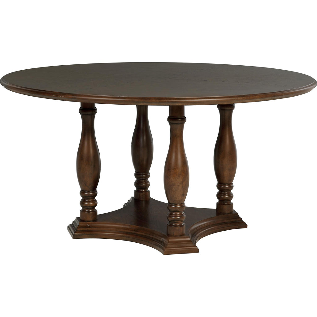 The combination of ivory upholstery and a rich brown wood finish creates clean, precise style for this traditional round dining set. Its crafted in quality rubberwood and engineered wood, delivering strength and durability paired with turned details. The table features a spacious r with a decorative edge and charming base design. Chairs add rounded, framed backs and plush foam cushions, perfect for leisurely meals with family and friends. The set lends handsome, refined character in your dining room or kitchen. This set includes one dining table and four side chairs.