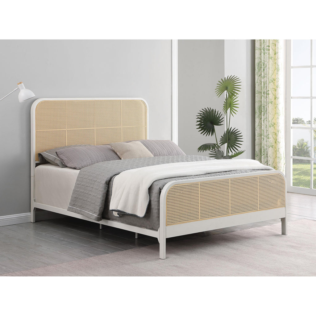 Introduce a touch of modern charm to your bedroom with this stylish metal bed. The bed features a powder coated metal frame with hand-brushed antiqued detailing. Rounded corners and a unique rattan-style woven design on the headboard and footboard. The sleek and sturdy construction ensures long-lasting durability, while the open, airy design adds a sense of space to your room. This bed is perfect for those who appreciate contemporary design with a hint of natural elegance.
