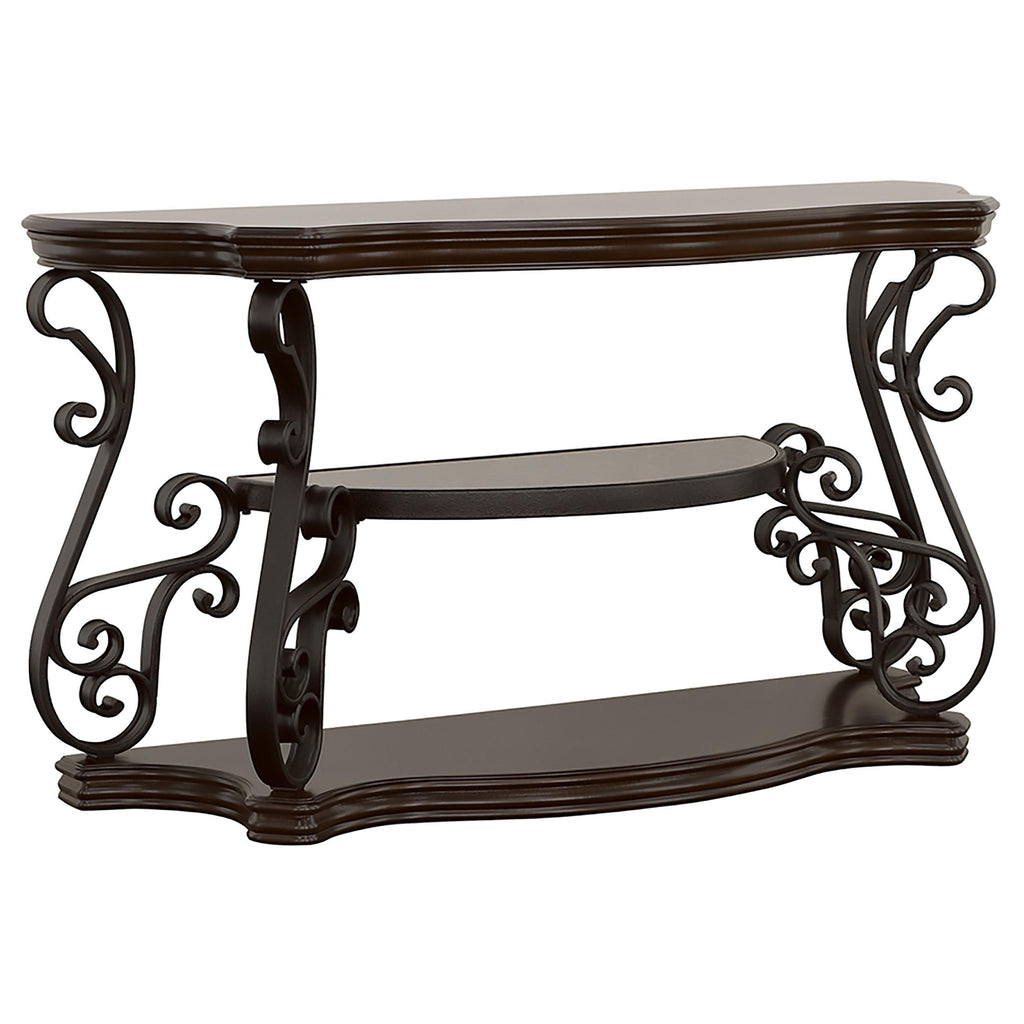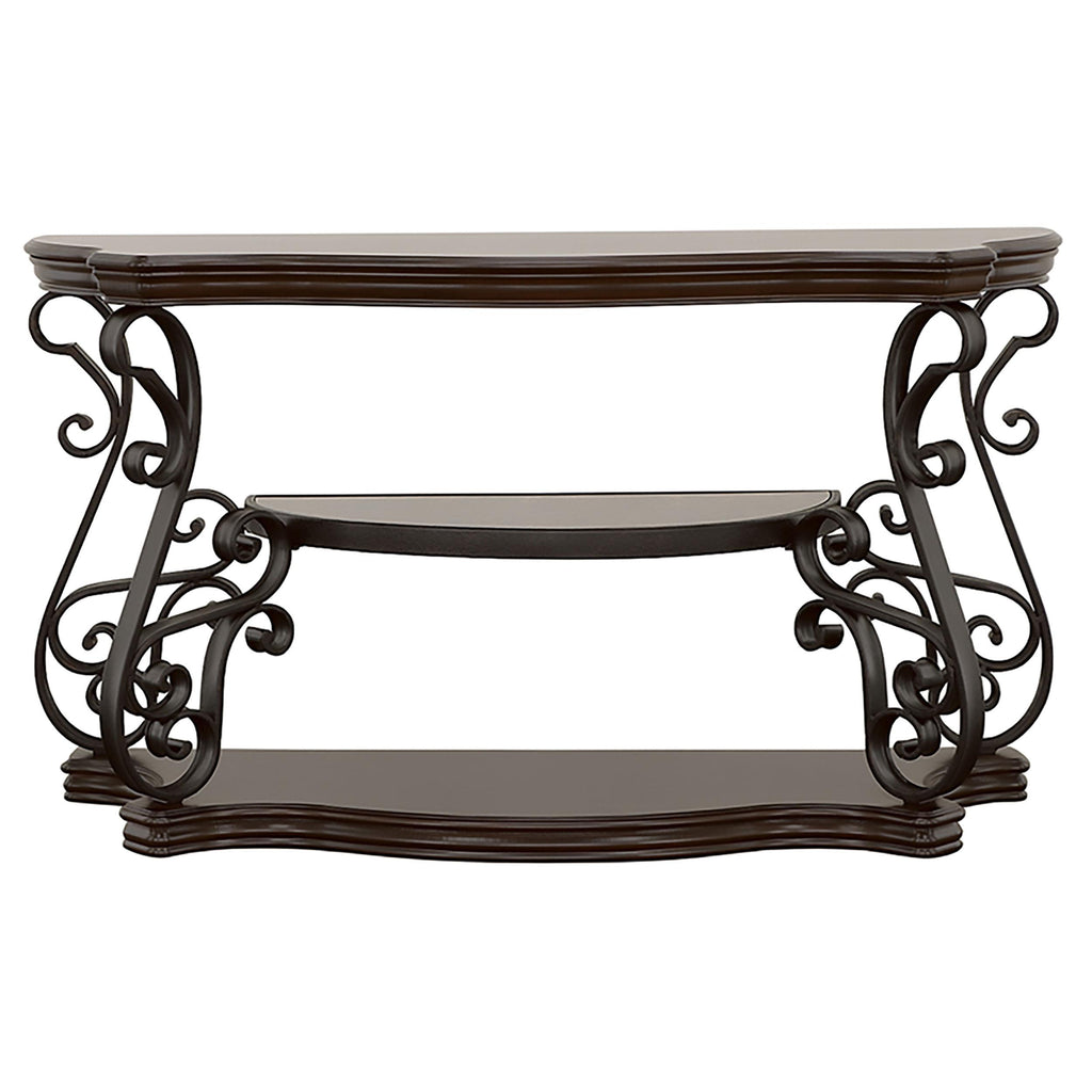 This elegant console table, also known as a sofa table, seamlessly combines style and function. Its dark merlot wood finish highlights the engineered wood and cherry veneer construction, while the ornate scrollwork on the dark bronze powder-coated metal legs enhances its timeless charm. The polished wooden middle and bottom shelves offer additional storage or display space. Perfect for accentuating hallways, living rooms, or behind sofas with classic sophistication.