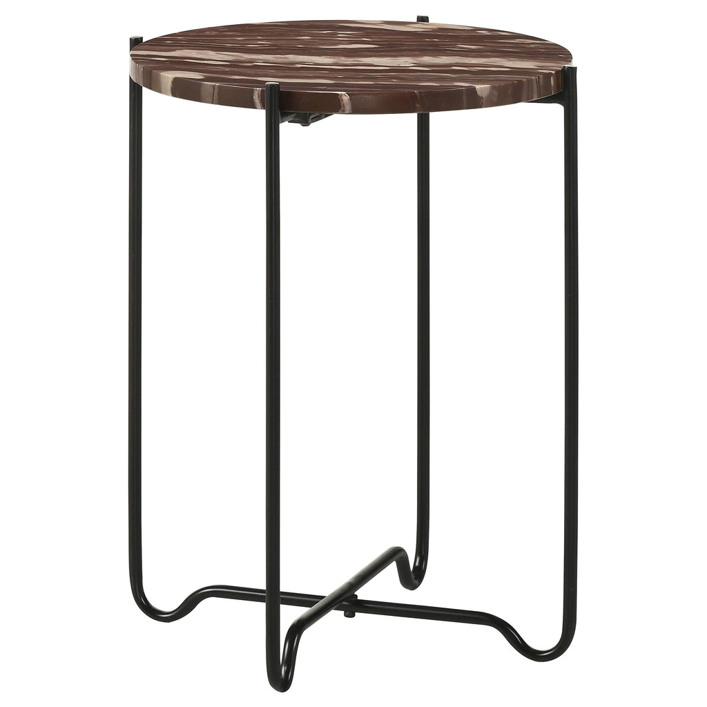 Classical elements offer a traditional touch to this minimal, transitional accent table. Created with a red marble top that offers a bold accent, this round accent table invites you to keep a refreshment close at hand as you relax in a chair or to showcase a cherished potted plant. Pulling together the dark hues is a black finish base in an X-shape design, lending to an industrial style aesthetic. With an open, airy look to the base, this accent table lends itself wonderfully to compact spaces. Keep it in a hallway or allow it to double as a nightstand beside a sleeper sofa in a guestroom.