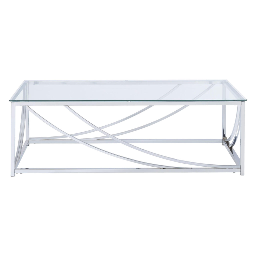 This rectangular coffee table boasts a modern design with a clear tempered glass top that highlights its sleek aesthetic. The sturdy metal frame, finished in electroplated polished chrome, features gracefully curved accents for an elegant touch. Its minimalist structure pairs style with durability, ensuring long-lasting use. Perfect for living rooms, this table combines functionality with a refined contemporary appeal.