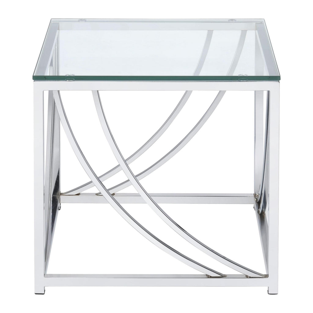 This square end table combines modern design with practical functionality, featuring a clear tempered glass top and a sleek metal frame finished in electroplated polished chrome. The gracefully curved metal accents enhance its contemporary style while adding a sophisticated touch. Its sturdy construction ensures long-lasting durability, making it a reliable and stylish addition to any living room, lounge, or seating area.