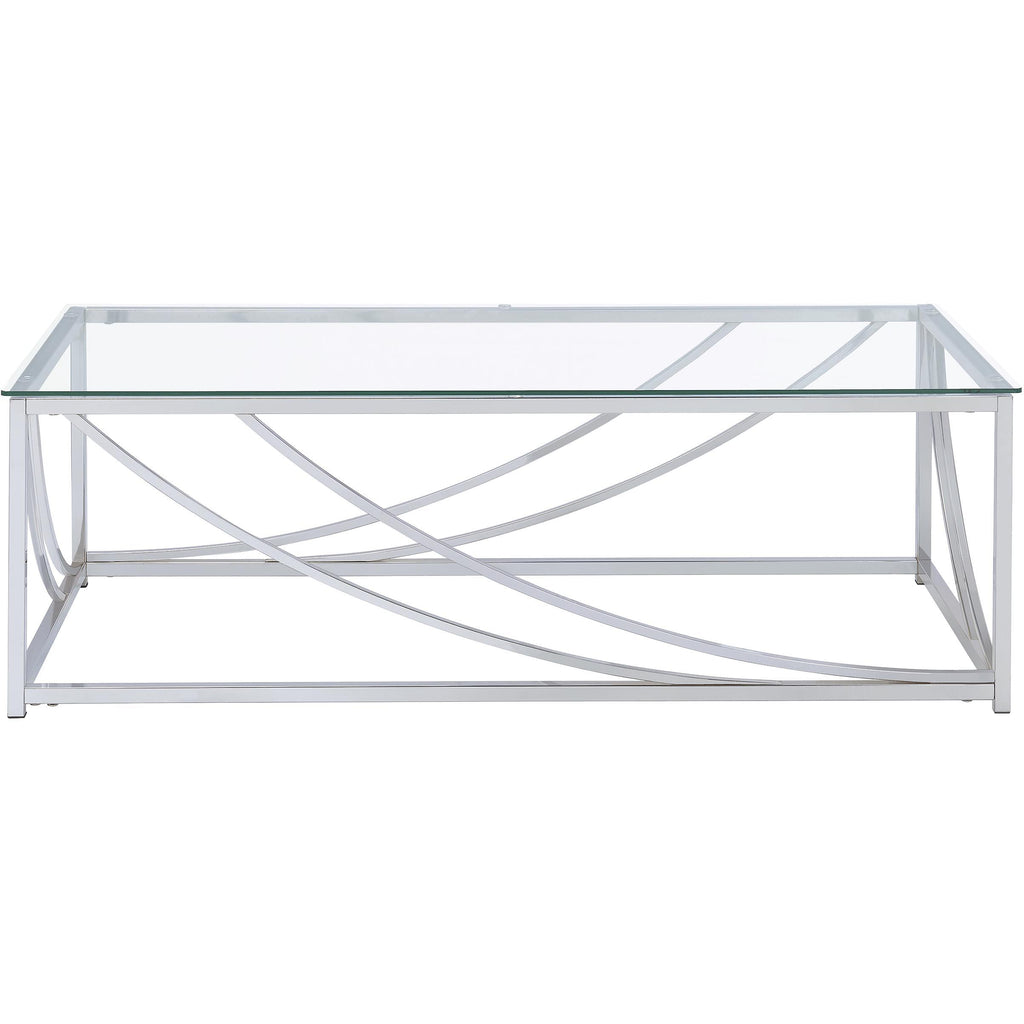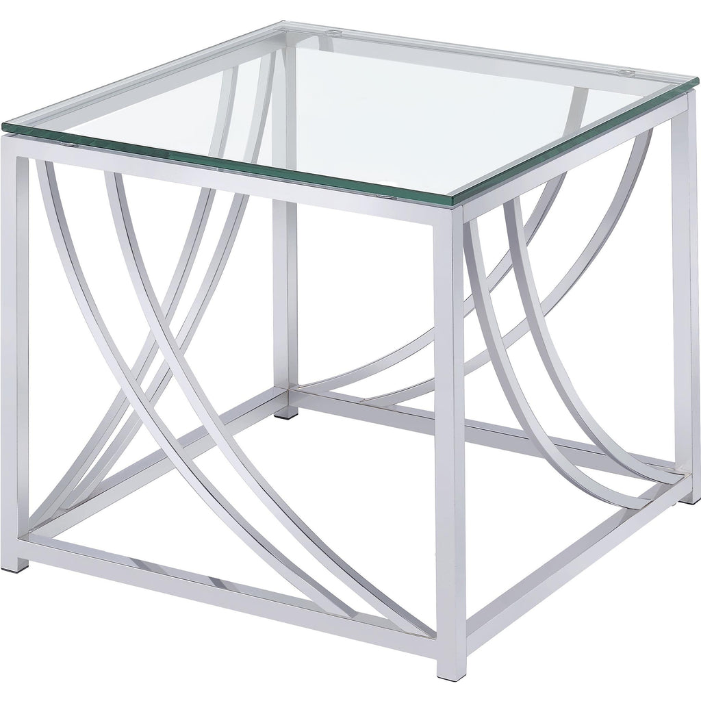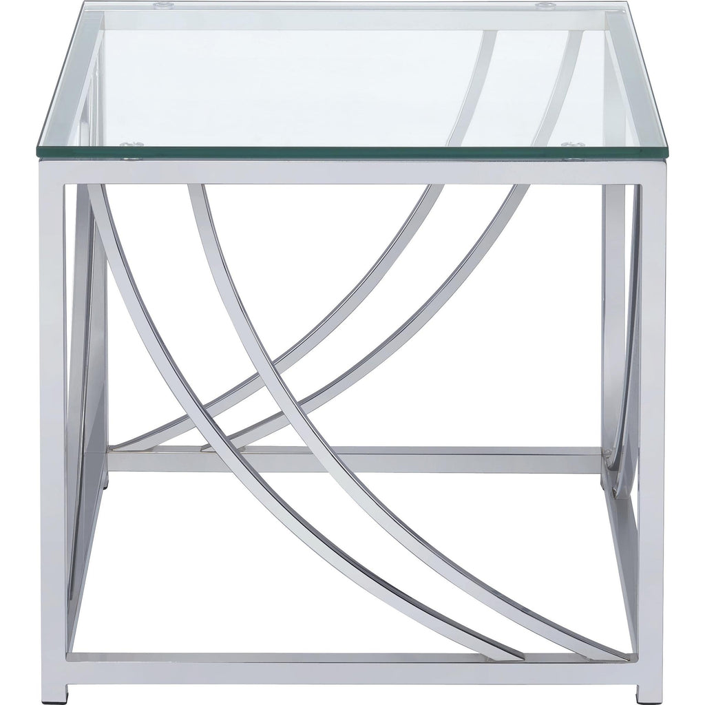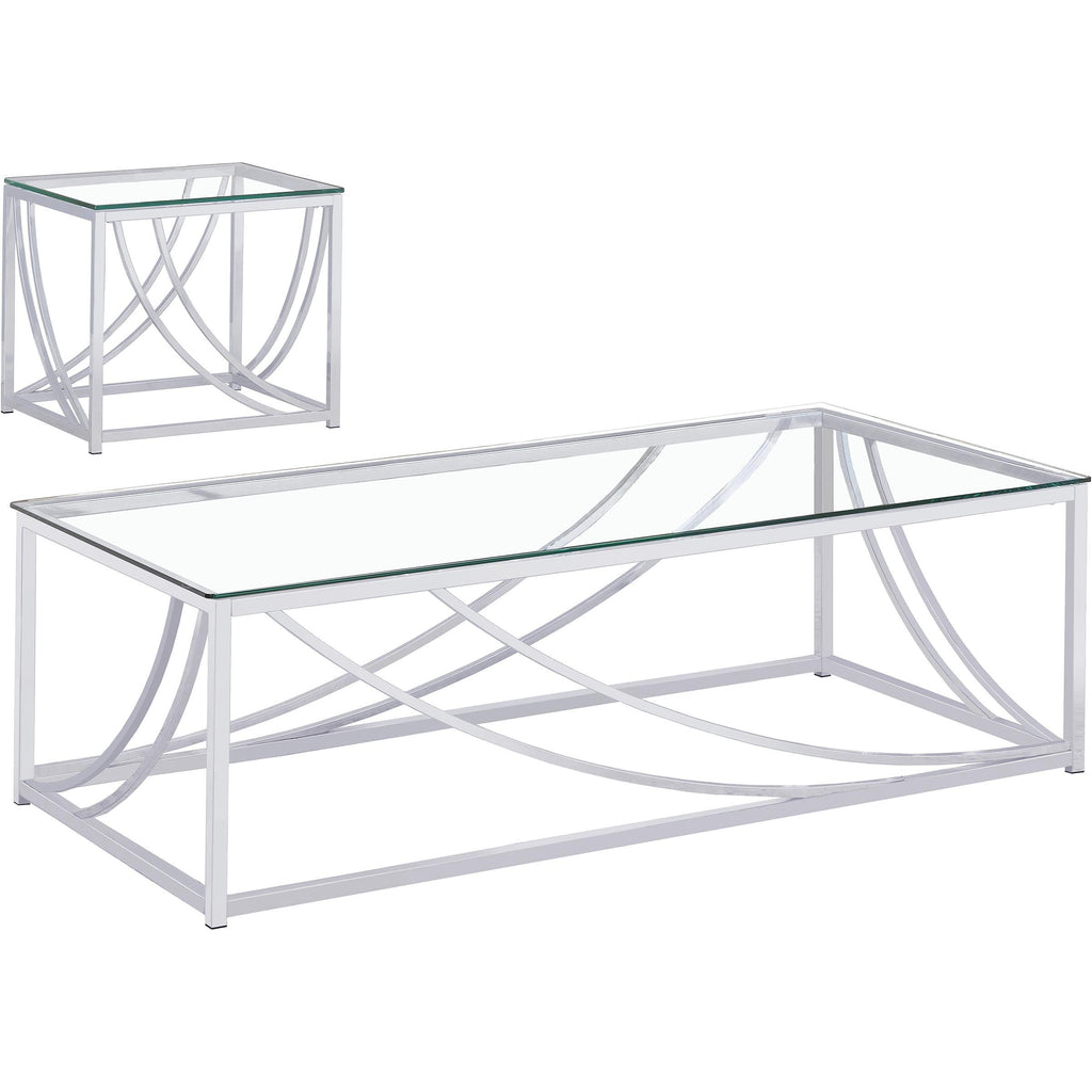This coffee table set, including a cocktail table and end table, blends sleek modern design with practical functionality. Both pieces feature clear tempered glass tops and electroplated polished chrome frames. The curved metal accents add a contemporary, elegant touch to the design. Built with sturdy metal construction, this set is durable and stylish, making it a perfect addition to any living room or seating area.