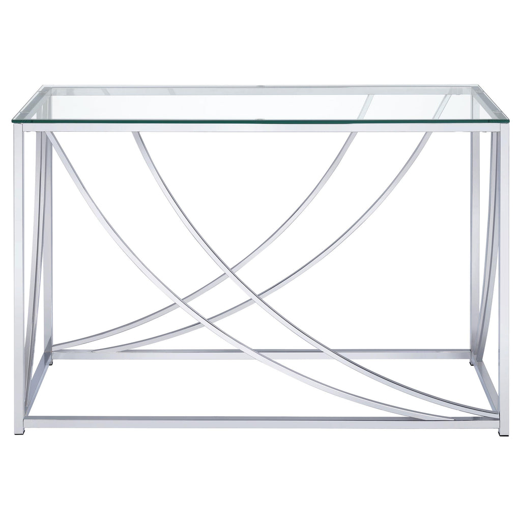 This rectangular console table combines modern elegance with practical design. Featuring a clear tempered glass top, it offers both durability and style. The electroplated chrome frame adds a sleek, polished finish, while gracefully curved metal accents enhance its sophisticated look. Ideal for placement in hallways, entryways, or behind a sofa, this table blends function with form, providing a stylish surface for display or storage in various living spaces.