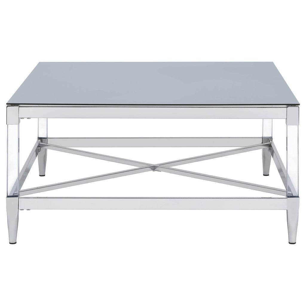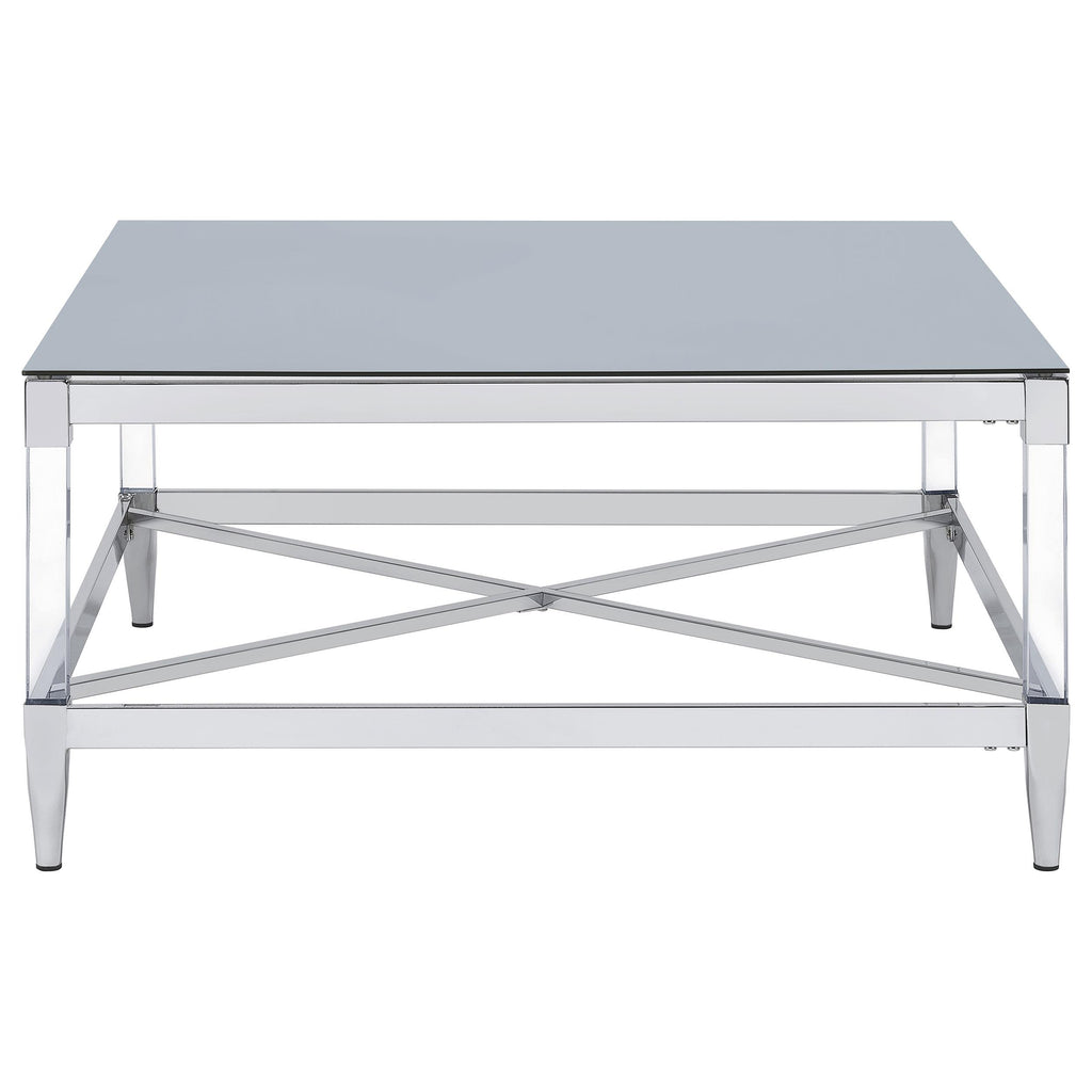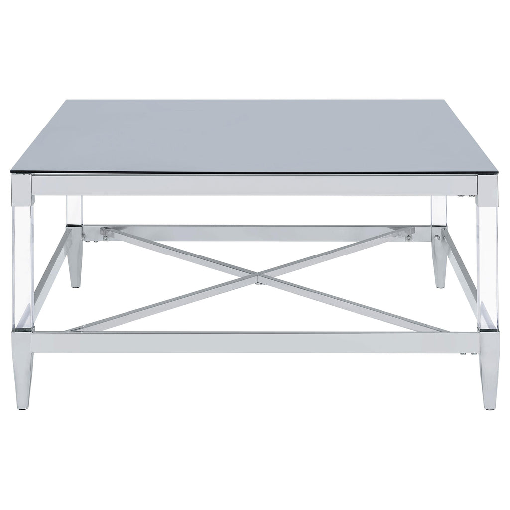 As the centerpiece of your living space, this coffee table exudes sophistication and contemporary elegance. Its square mirrored tempered glass top reflects ambient light and color, creating a vibrant focal point. The chrome-electroplated metal frame showcases sleek lines, complemented by acrylic leg posts that add a floating, modern aesthetic. Anchored by tapered feet, this table combines bold design and refined functionality, making it perfect for modern living rooms.