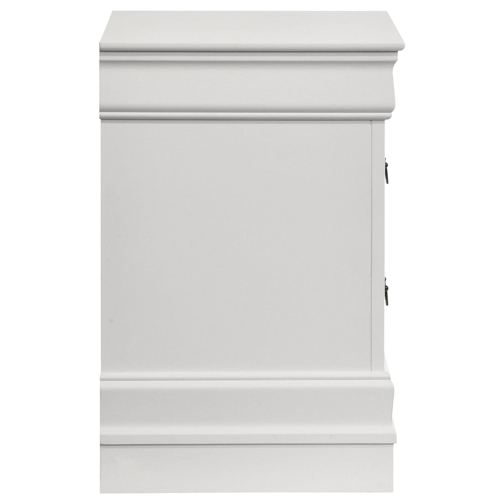 Add easy storage to your bedside with a stylish transitional two-drawer nightstand. In white, it's a versatile choice that complements a wide range of beds, linens, and surrounding decor. The nightstand offers a spacious top for a reading lamp and your phone, with drawers for overnights essentials. Each drawer is accented with a dark finish hanging pull and is built with a smooth metal glide for seamless performance. Molded trim and bracket feet complete the look, offering refined, understated style perfect for an approachable bedroom.