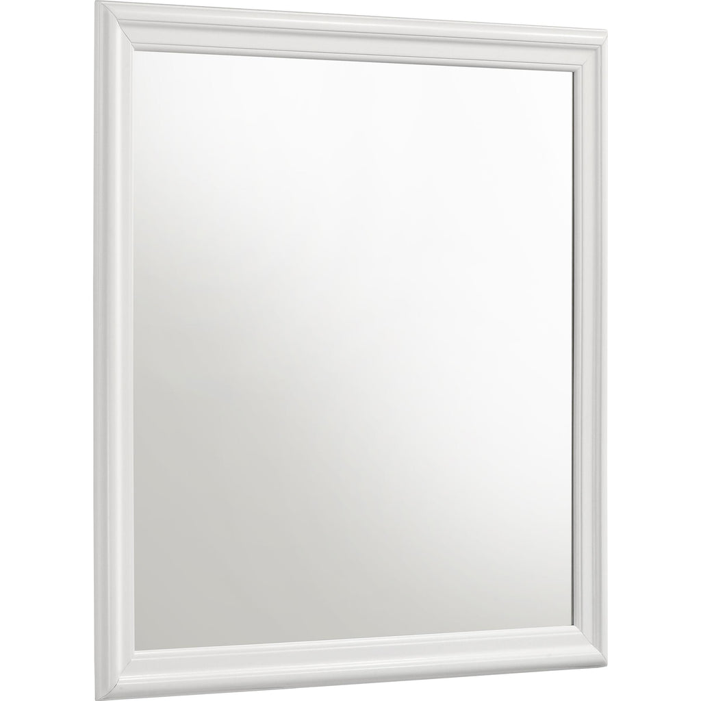 Soothing, relaxed style infuses a four-piece transitional bedroom set. In cool white, it features a versatile design profile accentuated with molded trim and dark finish hanging pulls on drawers. The set centers on a stylish bed, boasting a panel style design for its tall headboard and low footboard, creating an open, airy silhouette that complements in modern settings. The set includes plenty of storage with a six-drawer dresser and mirror, five-drawer chest, and a two-drawer nightstand. Each features a refined, understated silhouette and bracket feet that add a touch of dimension and depth. This set includes the bed headboard, footboard and rails, a dresser with a dresser mirror, a chest and a nightstand.