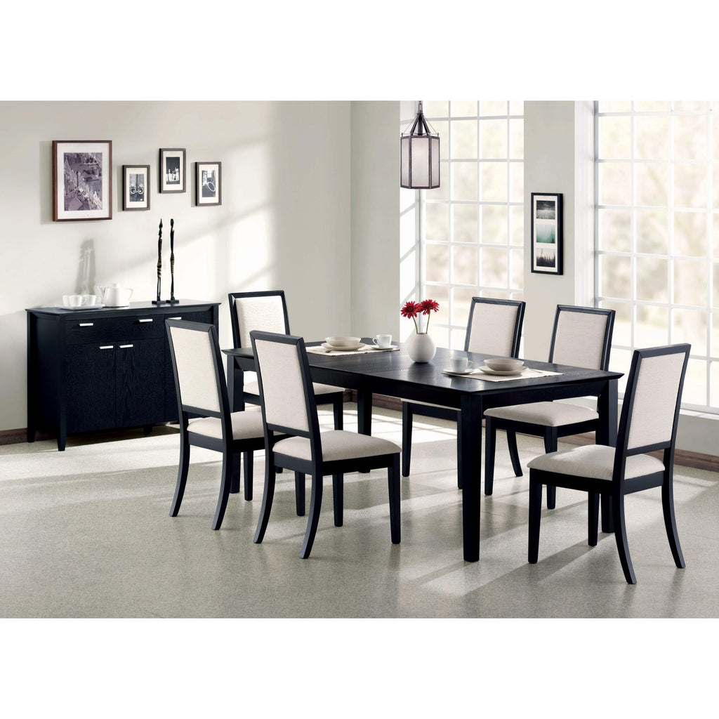 This Louise five-piece dining set from Coaster Furniture is crafted from Asian hardwood and ash veneer in a black finish offering a contemporary design. The dining table features a rectangular tabletop with an 18-inch extension leaf with brass plated table locks and tapered legs. The chairs have a wood-framed, cream color upholstered back and seat cushion and front tapered legs. This set includes a dining table and six dining side chairs.
