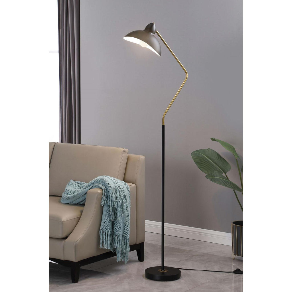 A contemporary floor lamp takes a classic mid-century inspired profile and updates it with modern flair. In black and gold, the lamp boasts a slim post with a V-curved arm that ensures bright downlighting perfect for an armchair or desk. A black metal shade completes the look with a wavy edge and a bright white interior for true lighting. The shade easily adjusts to focus illumination just where you need it. A round base is chic and understated, while a foot switch on the cord makes for seamless operation.