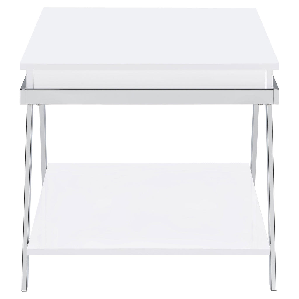 Go full-on modern with a casual feel that delivers a surprising energetic boost. This ultra-contemporary end table made of white high gloss finish MDF with paper coating creates a stir in your laid-back living room or family room. Angular metal framing adds a fresh aesthetic boost. A modular-like configuration works well in today’s trending spaces as this end table increases storage and display space with a lower shelf. Seek a seamless contemporary attitude with this stylish end table.