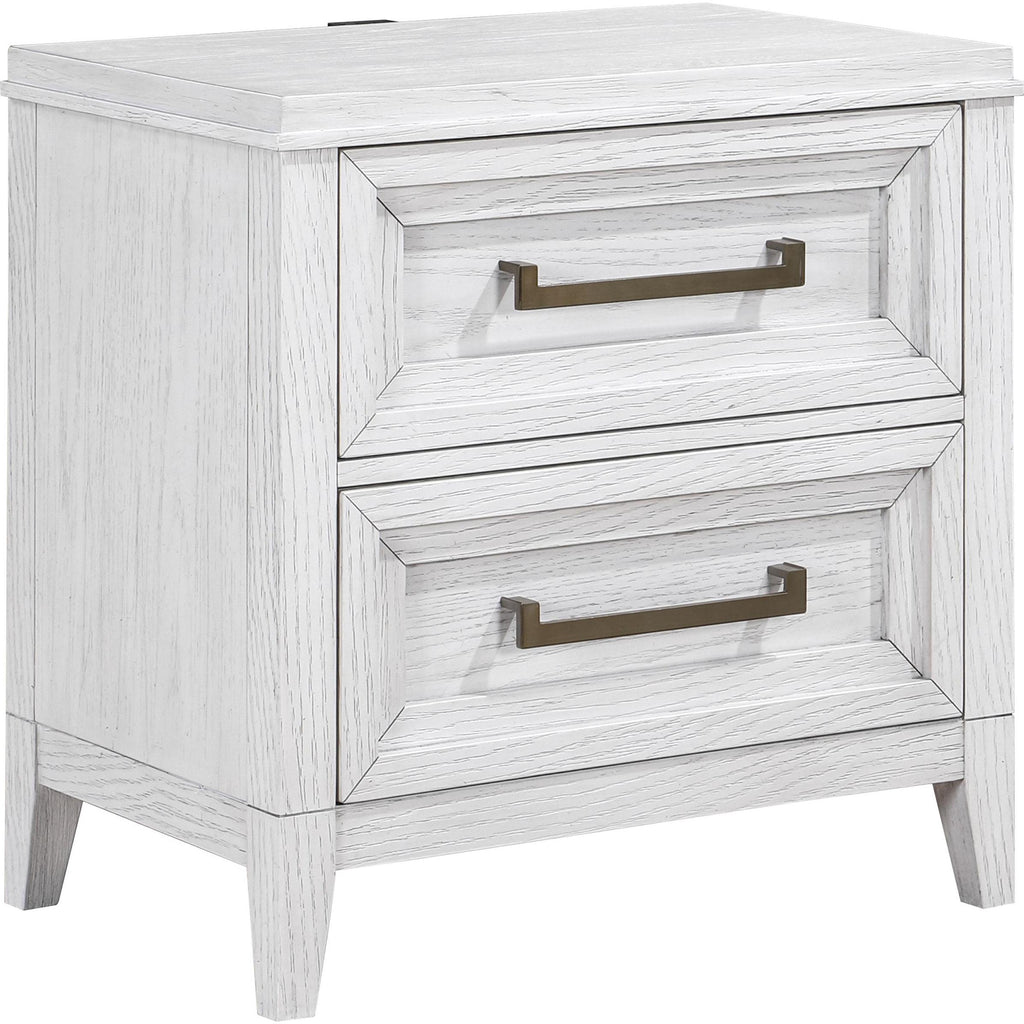 Distinctive hardware and layered trim work create a refined but dimensional effect for a five-piece modern bedroom set. In distressed white with wood grain texturing, it's a complete set that includes an upholstered bed with a padded headboard, two-drawer nightstand, five-drawer chest, and six-drawer dresser and mirror. It delivers ample storage and easy organization in a cohesive bedroom ensemble. The bed features a contemporary, open silhouette with a tall headboard and low footboard. Add colorful linens for a fresh look or stick with crisp white for a soothing monochromatic effect.