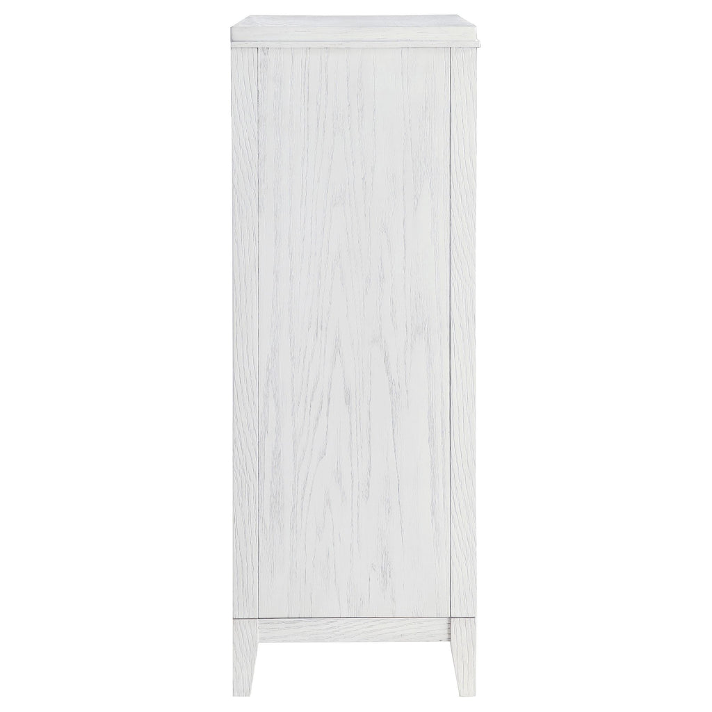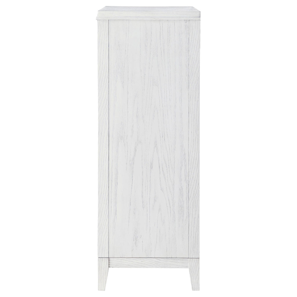 Add easy storage and inviting style to your bedroom with a modern five-drawer chest. It's tall, compact silhouette conserves space while adding welcome storage and organization. The chest features a distressed white finish to highlight wood grain details for a fresh, organic effect in your bedroom. Antique brass-toned bar pulls add contrast and definition on trimmed drawer fronts, creating inviting texture and depth. Tapered legs finish off this inviting look and a tip over restraint is included for added safety.