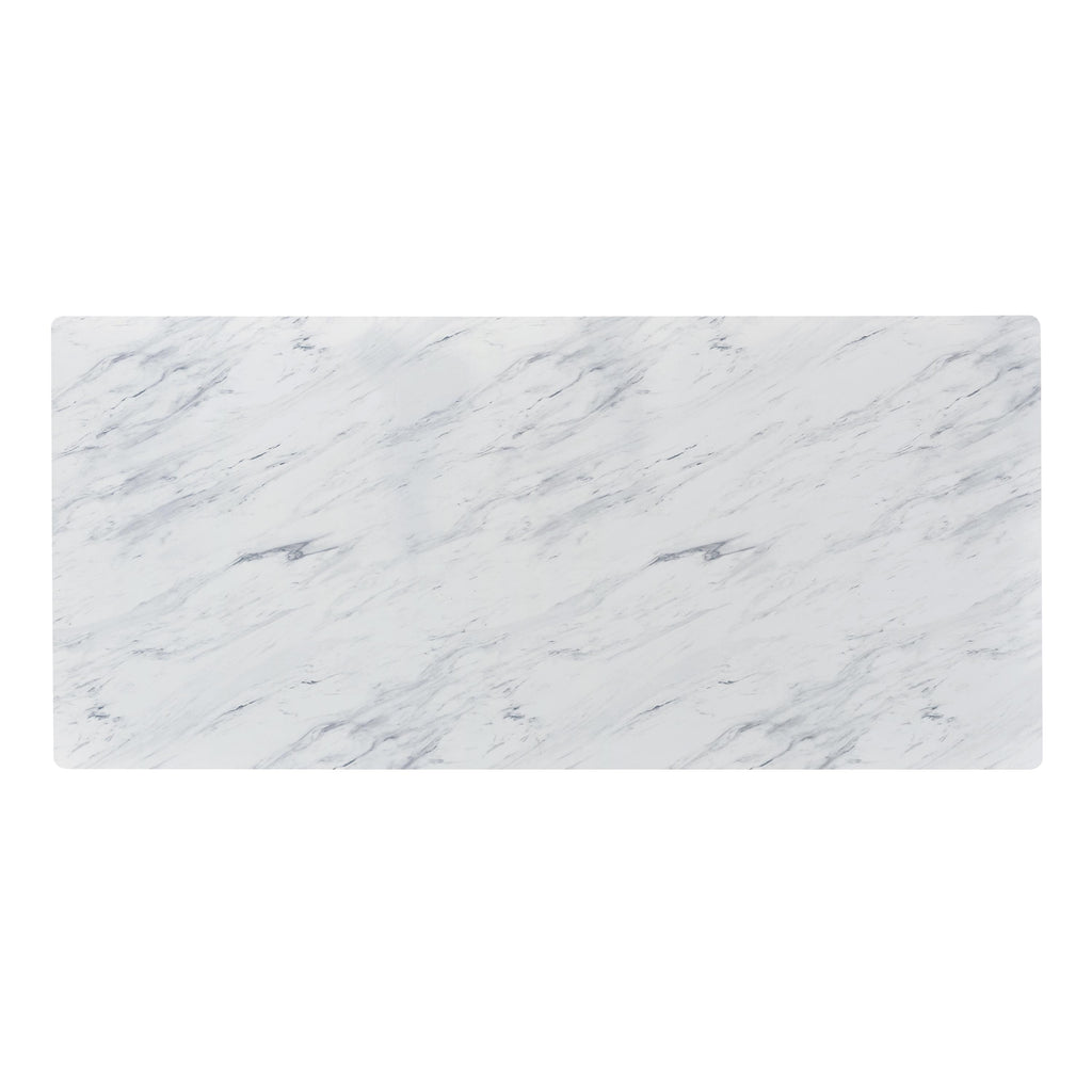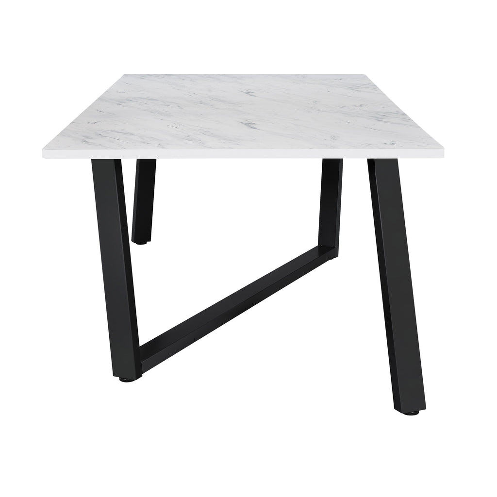 With a white marble-inspired tabletop design, this modern dining table creates a classical look to a space. Timeless traditional elements are contrasted by an asymmetrical metal base, featuring a singular diagonal trestle leg and two separate angled legs. The striking base offers a powder coated gunmetal finish for extra durability and resistance. The sleek and spacious tabletop offers seating for up to six guests too. Place this ultra-modern dining table in a formal dining area.