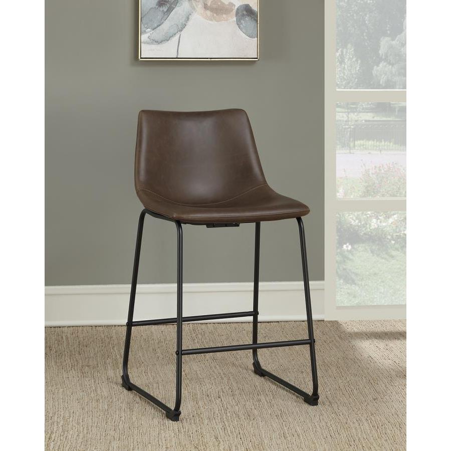 This cozy, casual stool will have you dining in style. With a supportive back and foot pedestal, it offers a comfortable place to enjoy a meal or a cocktail. Its seat is upholstered in beautiful, two-tone brown leatherette. Its base is constructed from high-quality metal in a striking black finish. With a sleek silhouette and a classic design, this stool looks fabulous in any dining area.