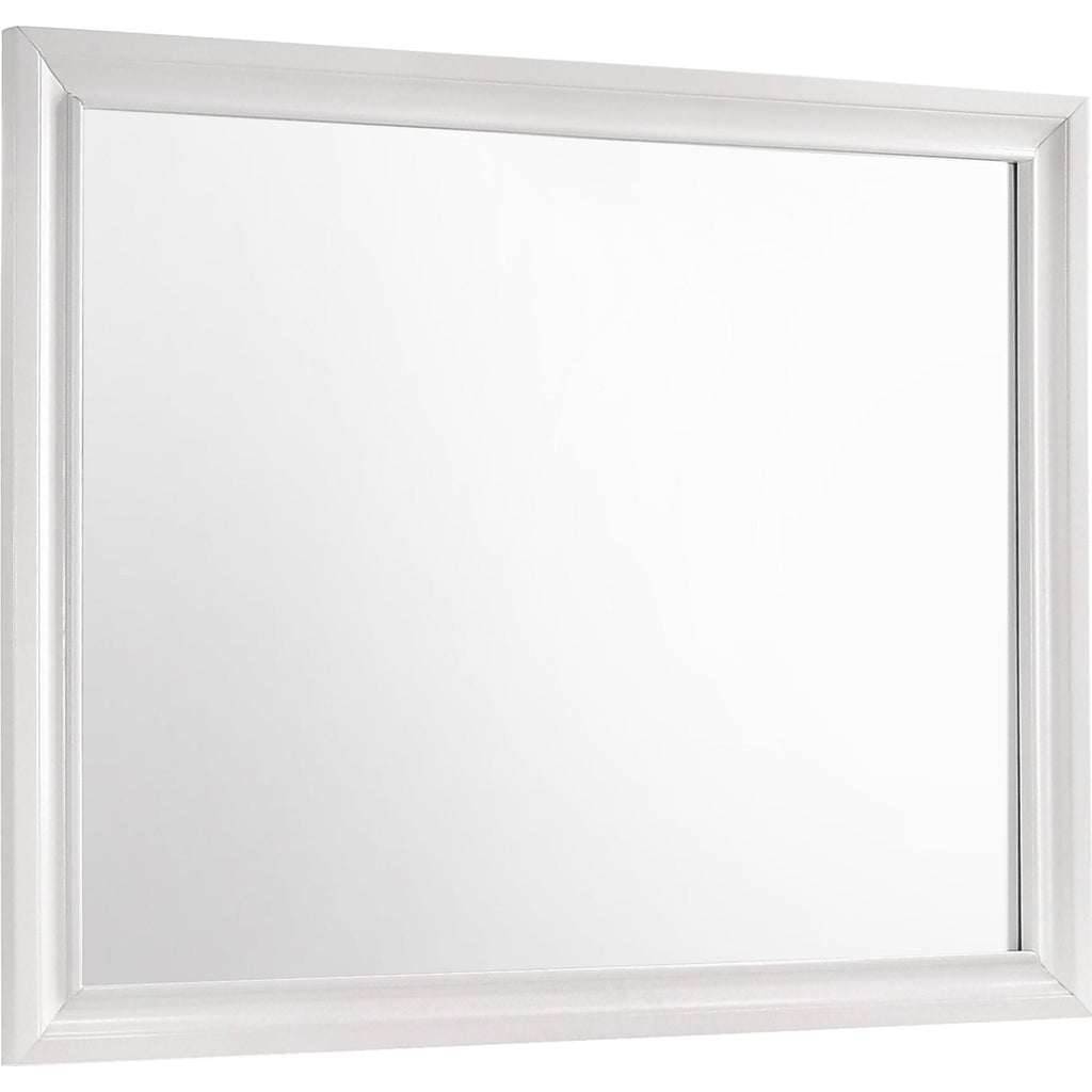 Sparkling diamond-like trim ups the glamour for a five-piece modern bedroom set. Compelling in its elegant simplicity, it centers on an upholstered bed and features a lightly textured white finish paired with smooth white molded trim. A nightstand, dresser with mirror, and chest provide plenty of drawers for easy storage and organization. Stripes of glittering, diamond-like trim and jewel-like bar pulls elevate the set, creating a fresh, sophisticated look and feel for your bedroom. Bracket feet complete the look with a touch of movement.