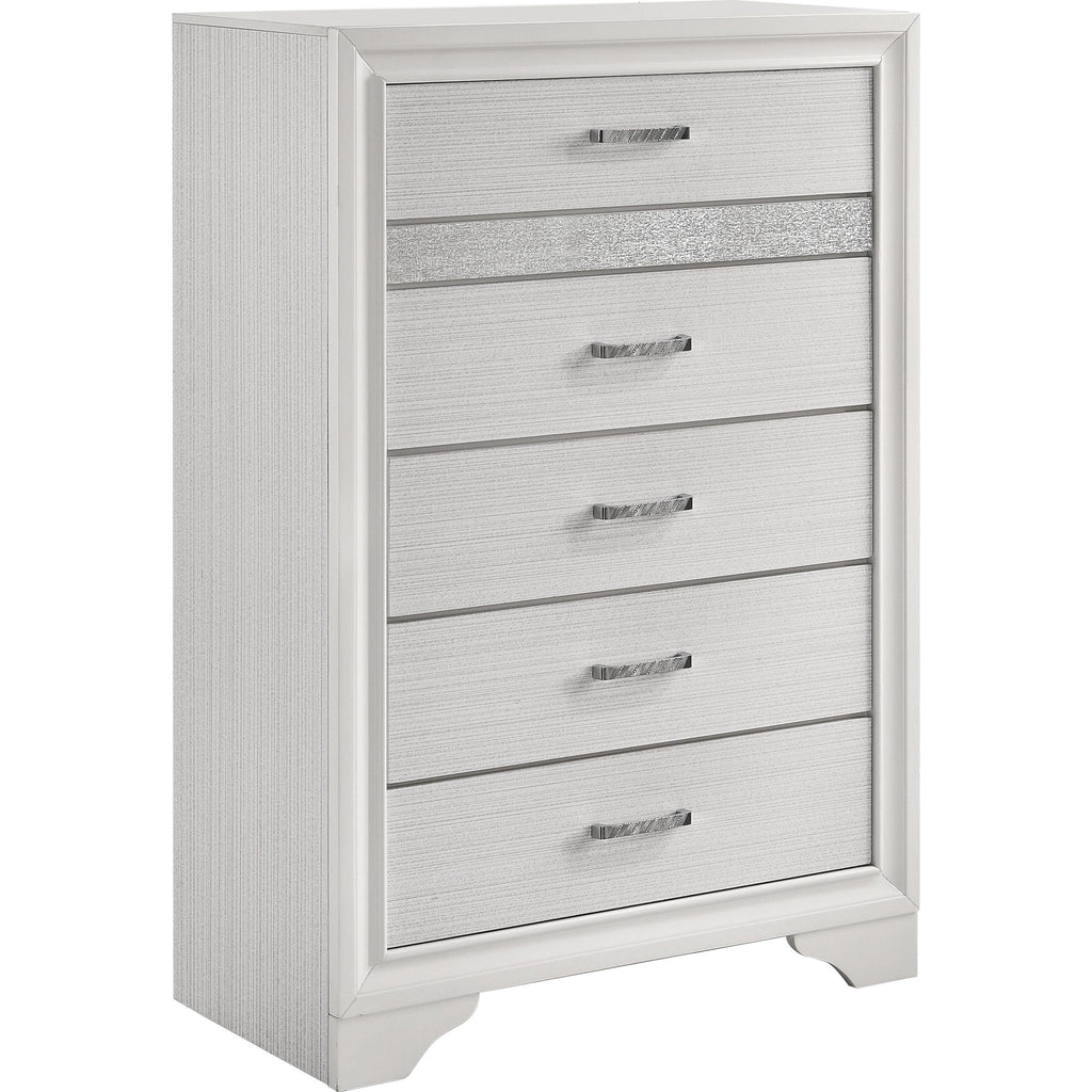 Sparkling diamond-like trim ups the glamour for a five-piece modern bedroom set. Compelling in its elegant simplicity, it centers on an upholstered bed and features a lightly textured white finish paired with smooth white molded trim. A nightstand, dresser with mirror, and chest provide plenty of drawers for easy storage and organization. Stripes of glittering, diamond-like trim and jewel-like bar pulls elevate the set, creating a fresh, sophisticated look and feel for your bedroom. Bracket feet complete the look with a touch of movement.