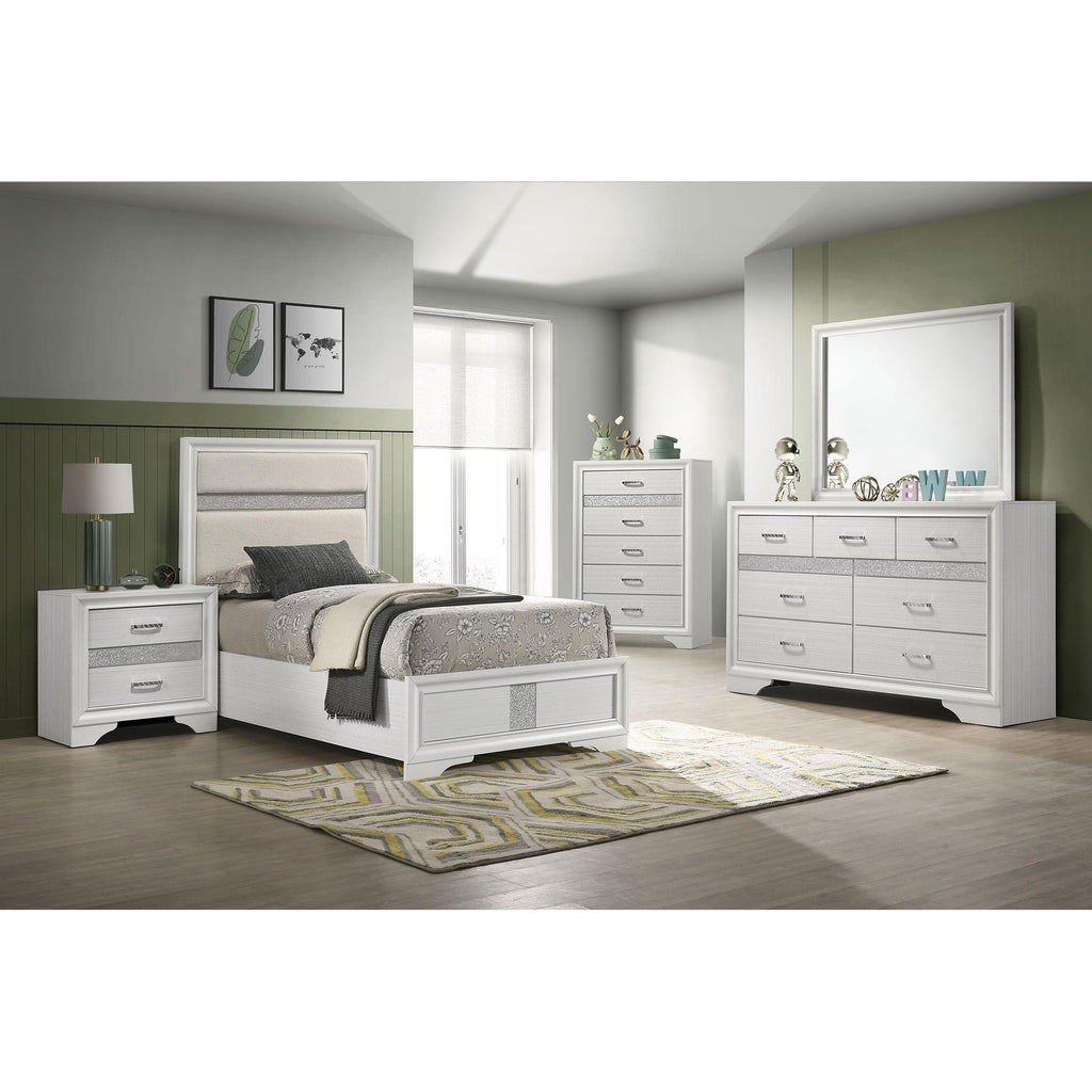 Sparkling diamond-like trim ups the glamour for a five-piece modern bedroom set. Compelling in its elegant simplicity, it centers on an upholstered bed and features a lightly textured white finish paired with smooth white molded trim. A nightstand, dresser with mirror, and chest provide plenty of drawers for easy storage and organization. Stripes of glittering, diamond-like trim and jewel-like bar pulls elevate the set, creating a fresh, sophisticated look and feel for your bedroom. Bracket feet complete the look with a touch of movement.