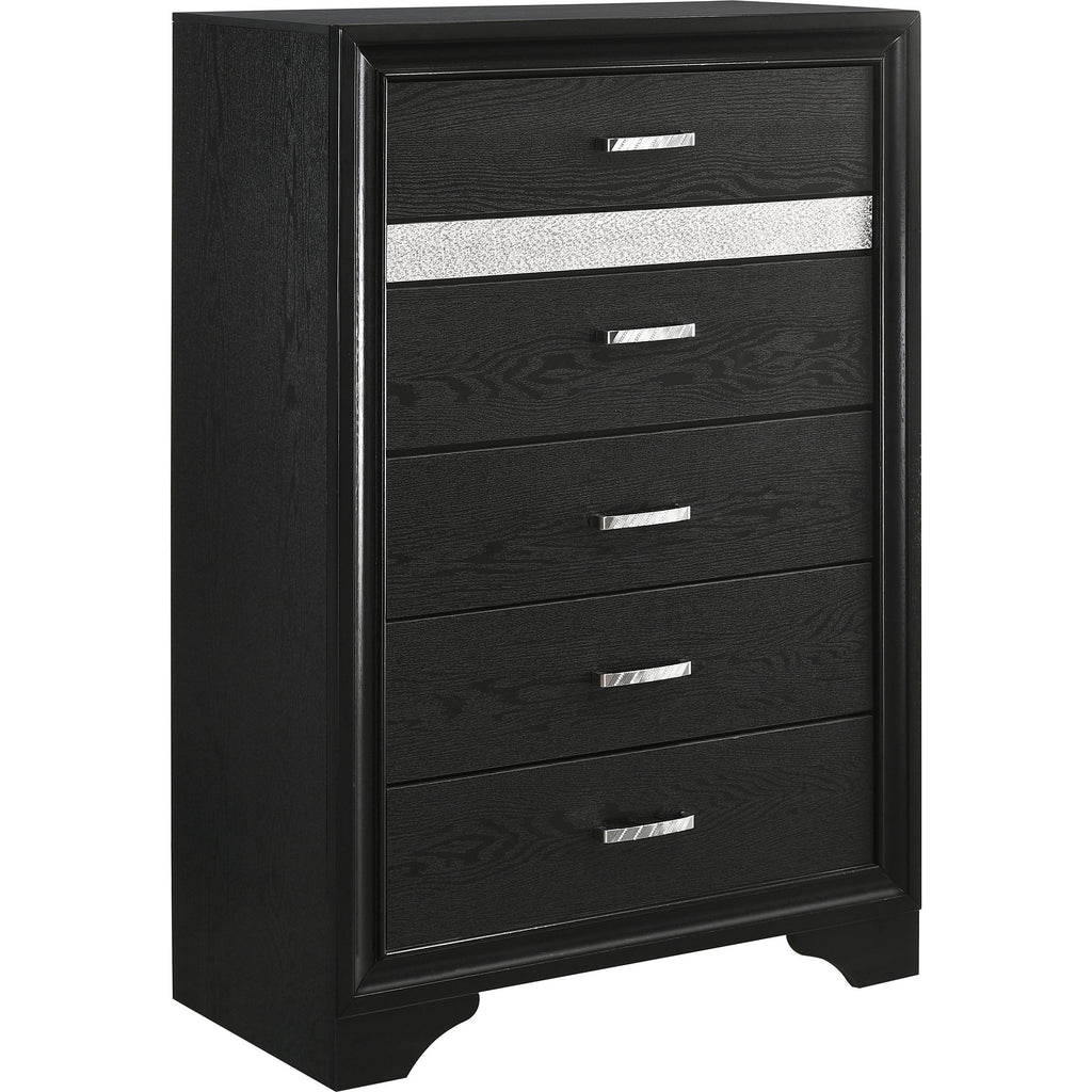 Sparkling trim brings the glamour of diamonds to this five-piece modern bedroom set. Designed to make a statement, it showcases a deep black finish with tuxedo inspired design elements that add glittering allure. The set centers on a chic bed, complete with an upholstered headboard and low footboard that create an airy, inviting pairing. The dresser, chest and nightstand each add ample storage, perfect for an organized bedroom ambiance. Each piece is complete with sparkling trim and jewelry inspired bar pulls on its drawer fronts that pull the look together perfectly.