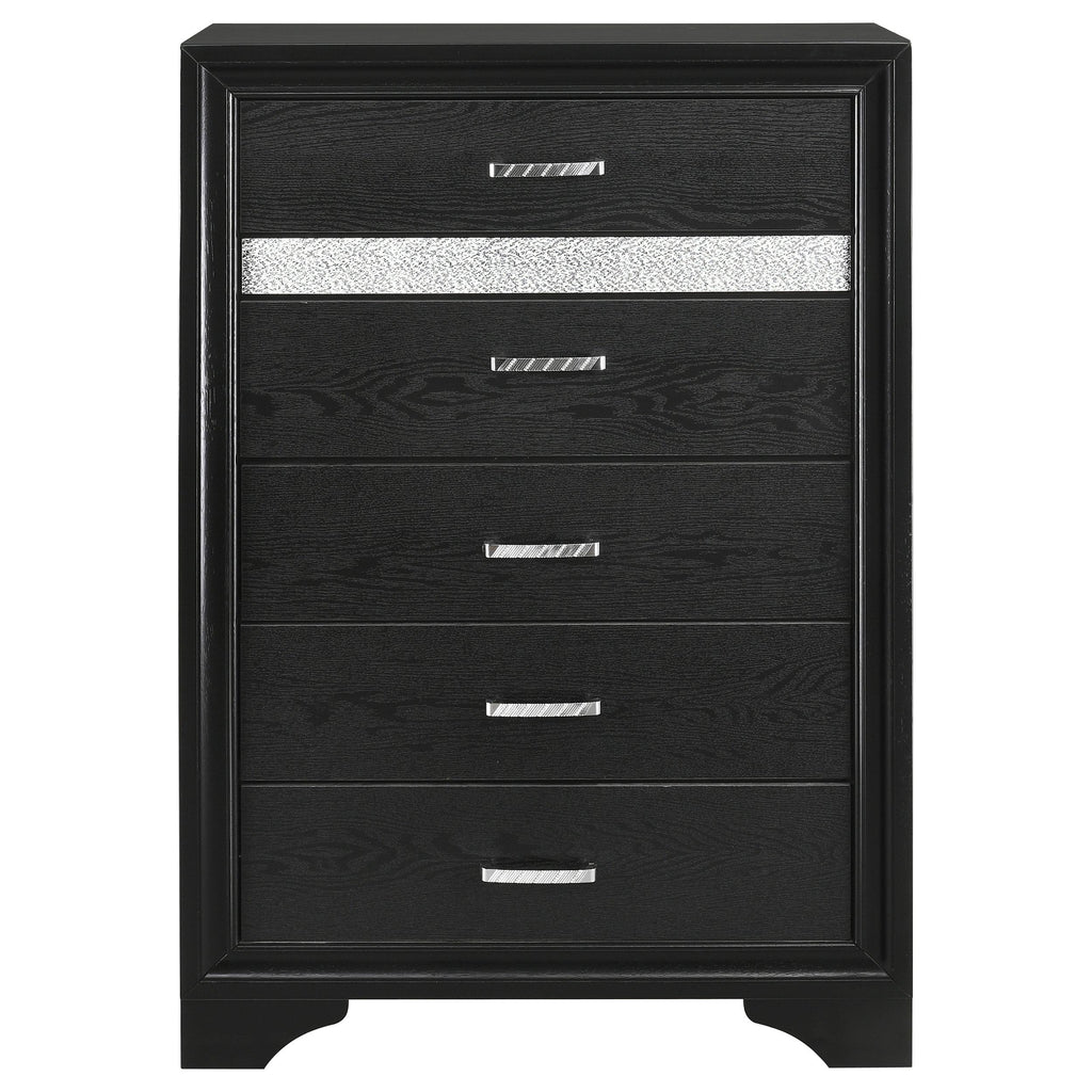Add posh, upscale ambiance to your bedroom decor. This chic, stylish chest livens up a room with a dazzling touch of sparkle. With a hidden jewelry drawer built in, it keeps valuable items safe and secure. Its drawers are lined with felt for a luxurious hint of softness. Its five convenient drawers are built with full extension glides for versatile ease of use.