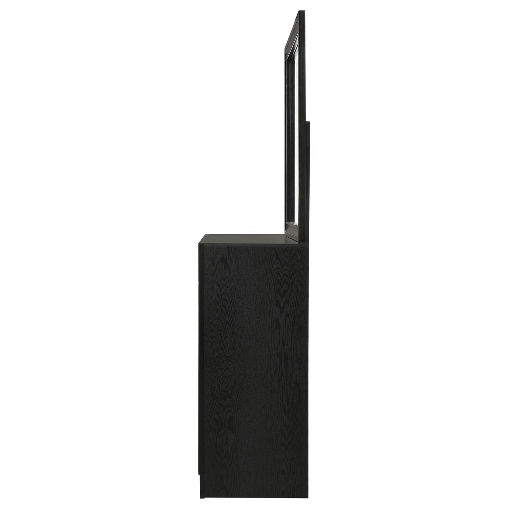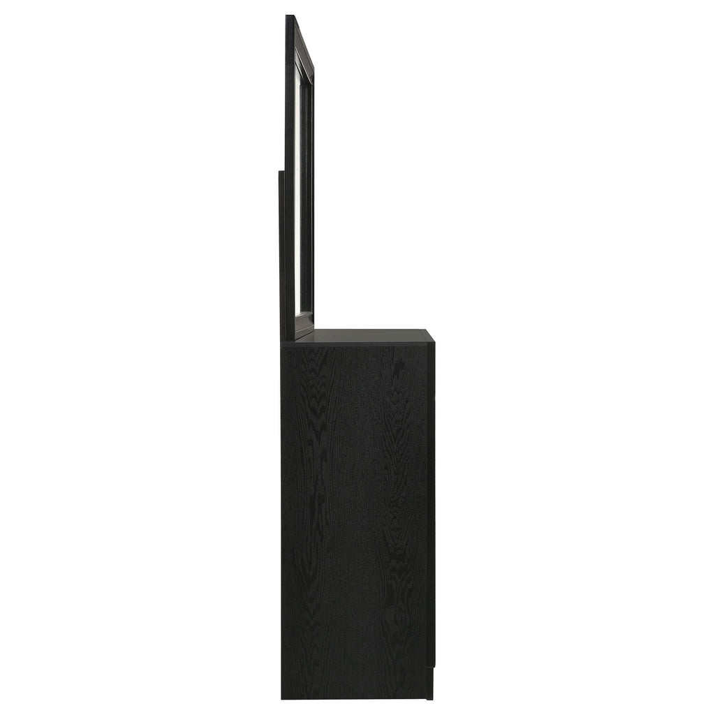 Elevate your bedroom with the chic and sophisticated grace of this dresser, featuring felt-lined drawers to keep your delicate belongings safe. The hidden jewelry drawer provides discreet storage for valuables, while the glittery front panel adds a touch of sparkling opulence. This beautiful dresser lends elegance to any space, complemented by the cheerful mirror with its linear, dimensional design. The framed construction of the mirror offers a stylish ambiance, and the choice of finishes allows you to tailor the look to your design scheme.