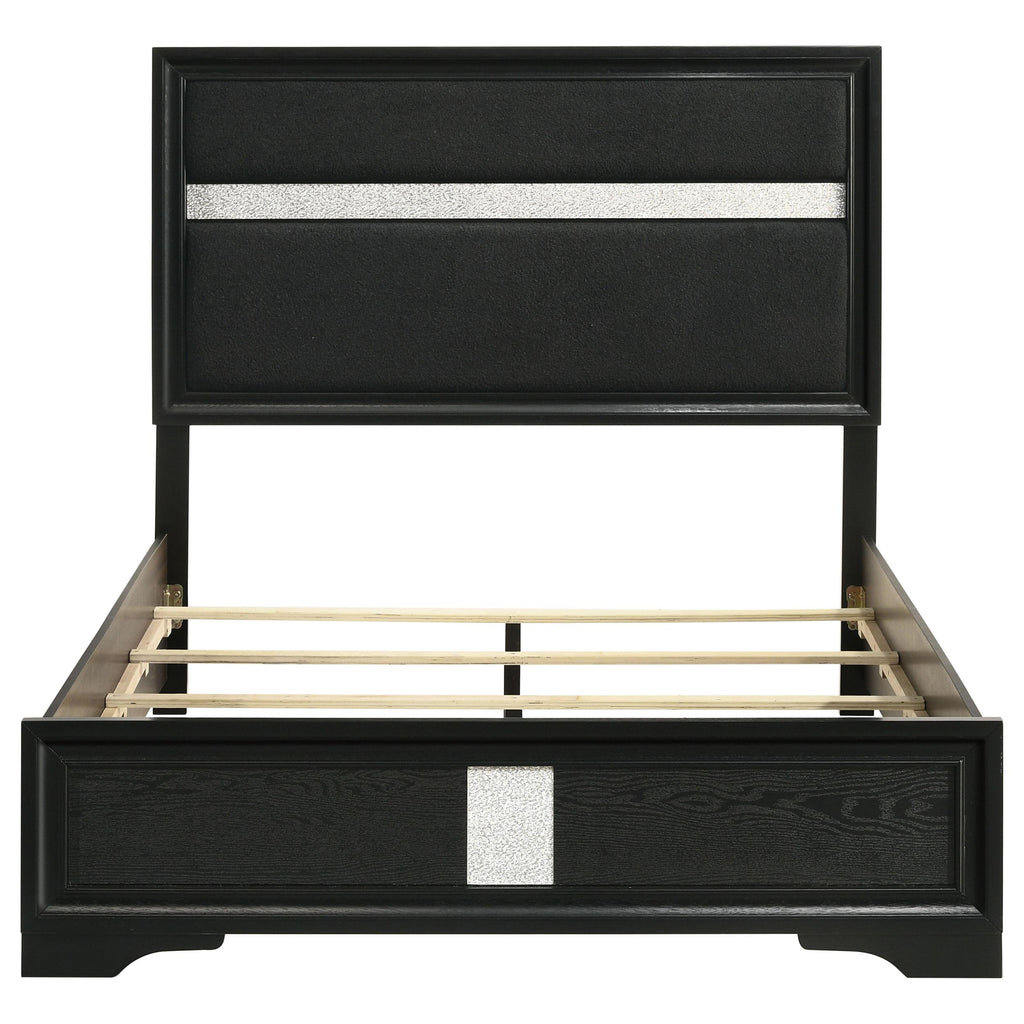 Embrace tuxedo style with the dramatic black and sparkling trim featured on a modern wooden bed. Its simple silhouette brings elegant presence with a rectangular headboard complete with upholstered panels, foam cushioning and black fabric. Glittering trim adds sparkle and elegance in a horizontal stripe on the headboard and vertical stripe on the footboard. The footboard adds a low profile, clean-lined touch, perfect for an open, airy bedroom. Thick side rails and bracket feet complete the bed to perfection.
