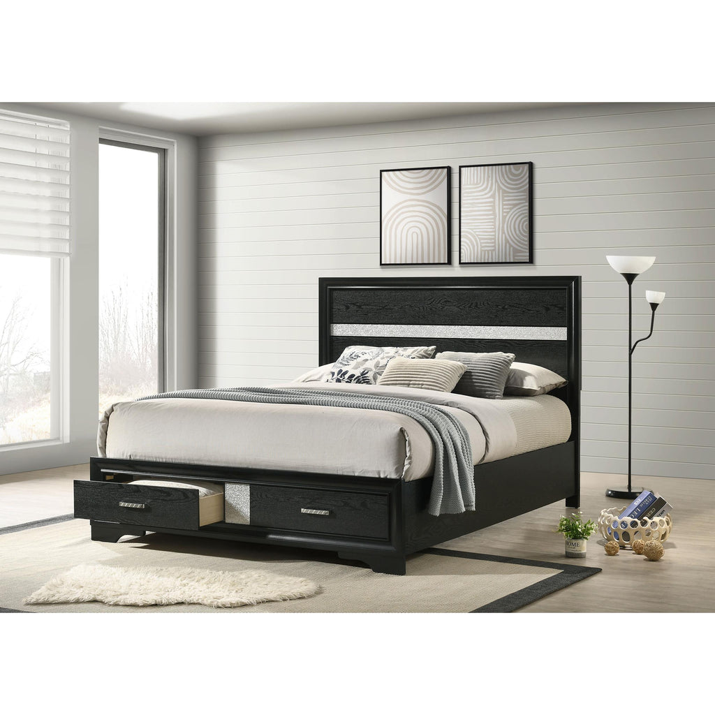 This alluring bed from the Miranda collection has both fashion and function. It features crisp lines and a headboard that's as simple as it is impressive. The footboard is built with two roomy drawers to hold extra sheets and blankets. The bed has an effortless timelessness and elegance. Add to the bedroom for a charming ambiance that's sure to please.