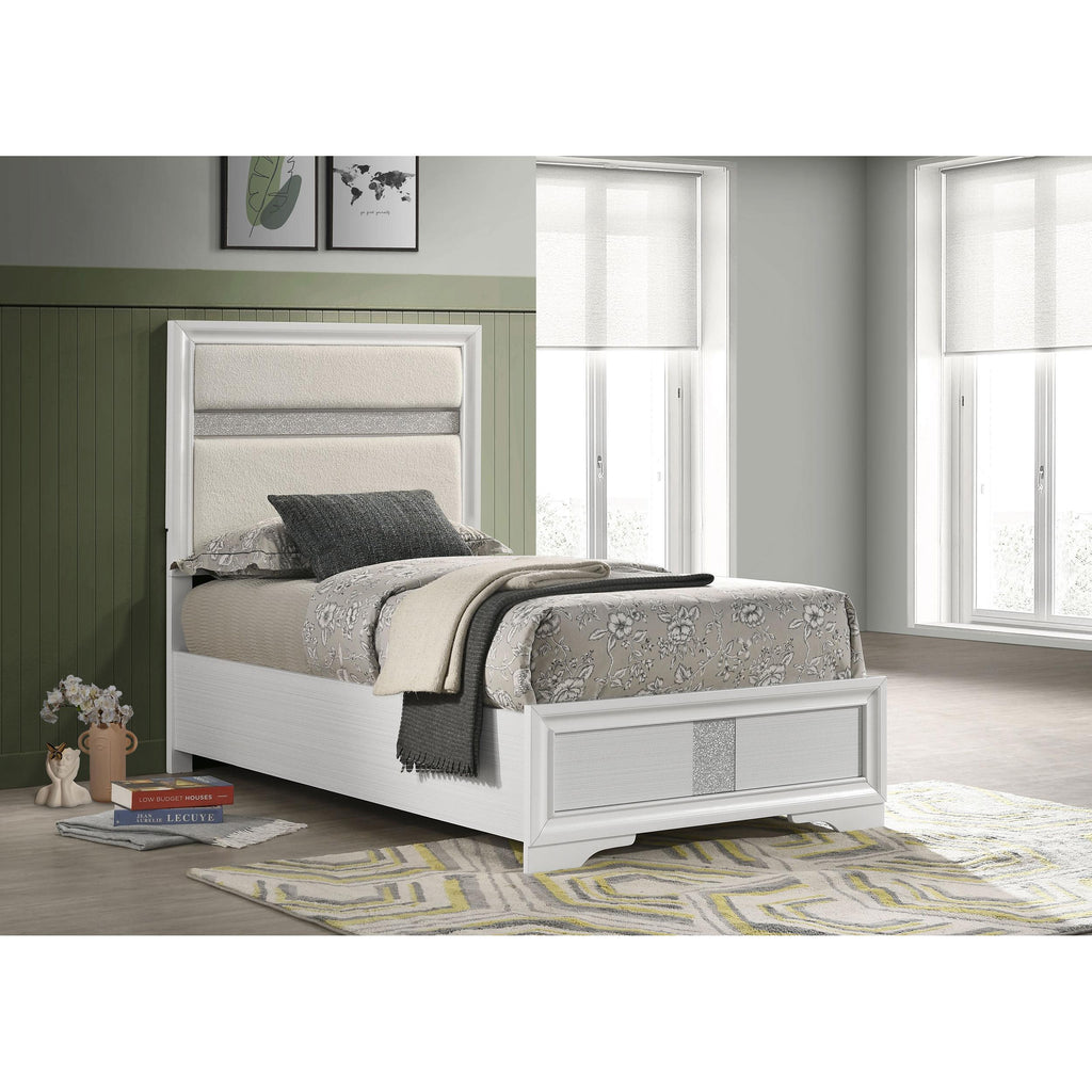 Introduce a little bit of glam flair to your bedroom with a modern upholstered bed. Featuring padded white fabric panels, the headboard is complete with molded trim and a horizontal stripe that glitters in the light. A matching vertical stripe on the low footboard is the perfect complement. A white finish is lightly textured on the panel footboard and rails, while trim is smooth and cool. The bed is complete with slats and center legs for added support and requires a foundation.