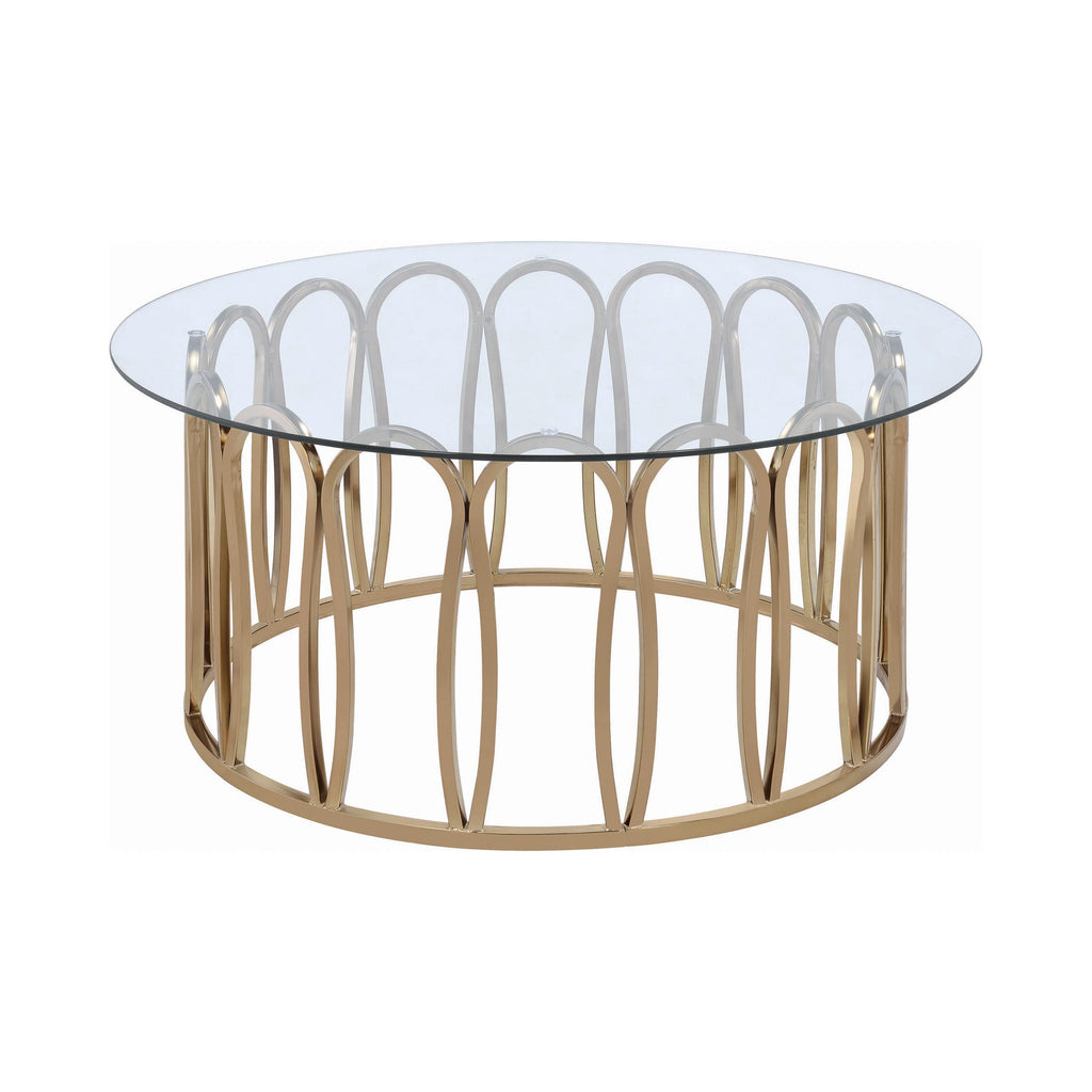 This round coffee table features a clear tempered glass top supported by a durable metal frame. The base is finished in a striking electroplated chocolate chrome, providing a deeper, rich brass tone. With its sleek design, this coffee table is an ideal addition to any living room or lounge area, offering both elegance and stability. The metal frame provides a modern touch, while the tempered glass top ensures long-lasting durability and ease of maintenance.
