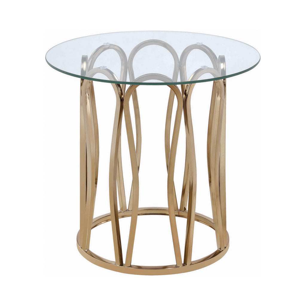 This round end table features a clear tempered glass top set atop a durable metal frame. The base is finished in electroplated chocolate chrome, offering a rich, deeper brass tone. The stylish geometric design creates an elegant look, while the tempered glass top is easy to maintain. This end table is perfect for any living room or lounge area, combining modern style with reliable stability and function.