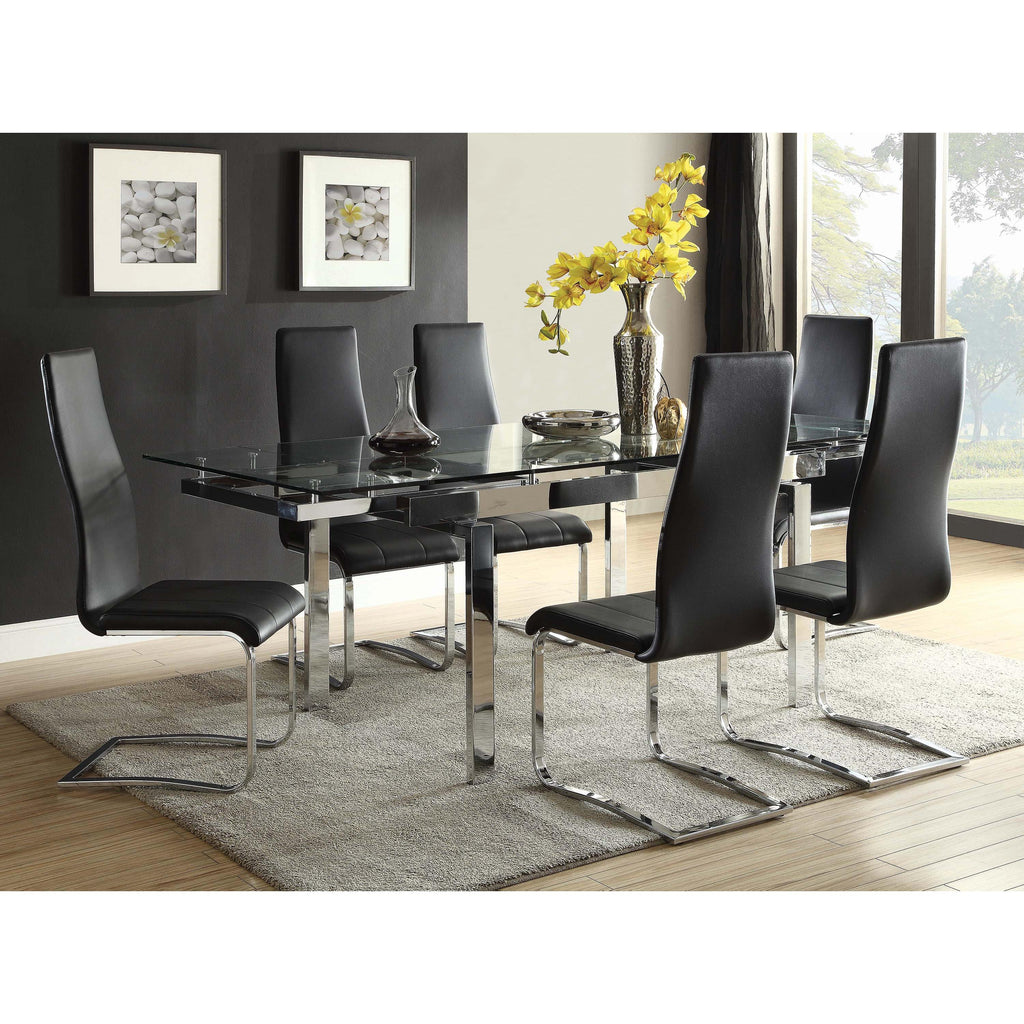 • Contemporary dining group with unique chrome finish bases in the foot of the table and chairs