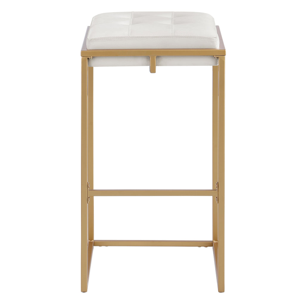 Sleek and sophisticated, these two modern glam stools offer a refreshingly chic style for bars and countertops. Slim, gold metal frames embrace the foam padded cushion, offering a comfy place to rest as you unwind and converse with guests and family. The square cushion tucked within offers charming details like button tufting and is upholstered in a plush velvet fabric for a supremely soft touch. Slide these stools up to your dining space with the slender sled base. A footrest in front offers extra support.