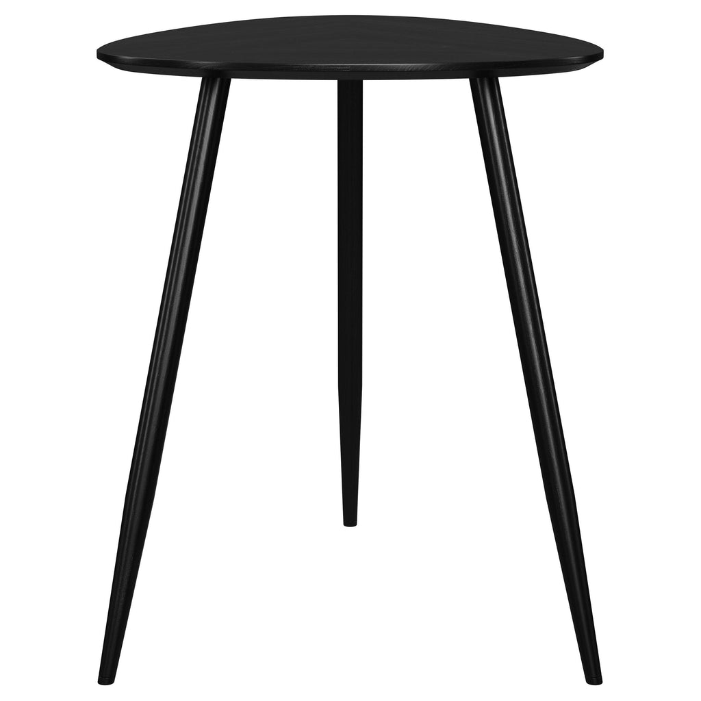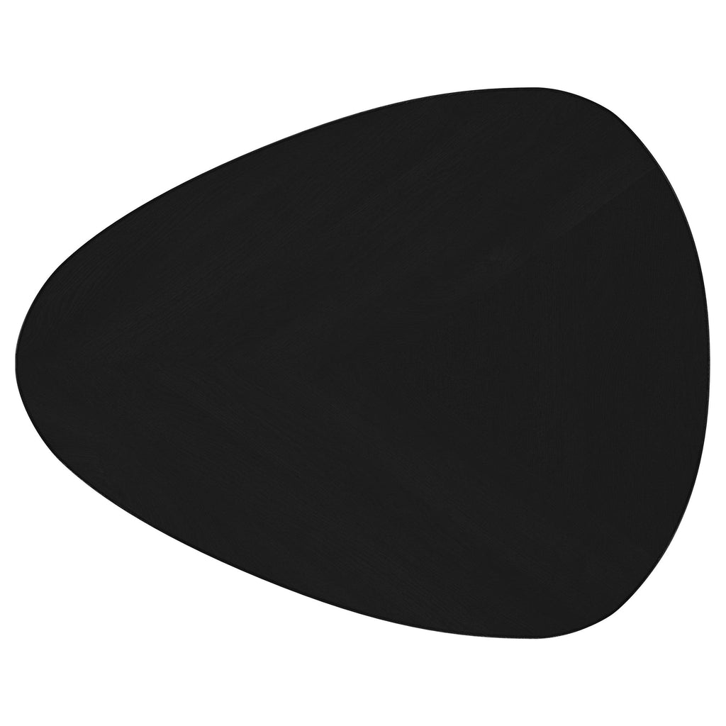 Introduce a modern flair to your living room or den with this sleek wooden end table. Finely crafted from solid mango wood, its deep black finish enhances its timeless elegance. The triangular tabletop features rounded corners, lending a softened, contemporary vibe. Supported by three tapering, splayed legs, the design exudes a light and airy feel. Perfect for flanking a sofa or armchair, this side table is ideal for showcasing a reading lamp or decorative accents.