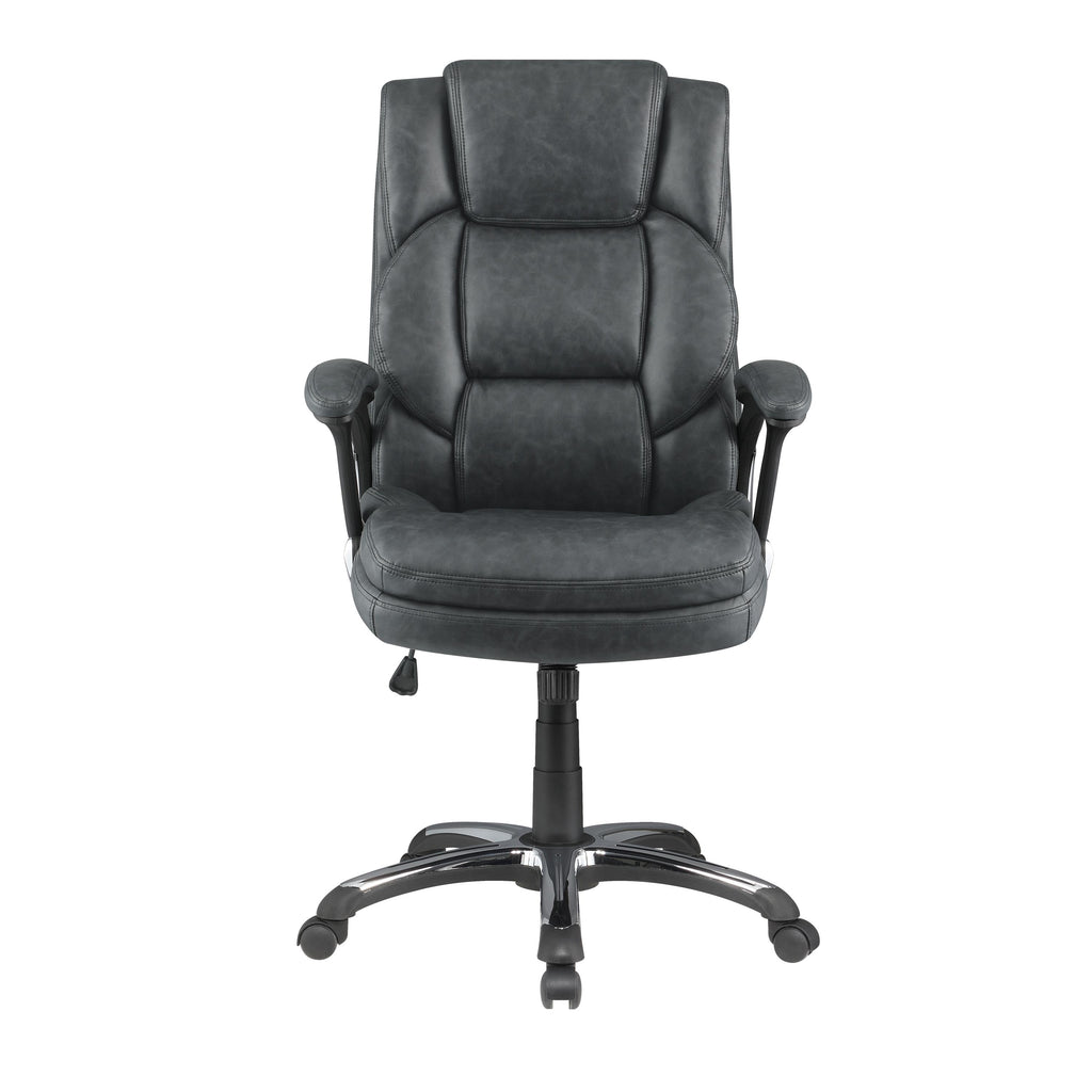 • Office chair with plush seating and headrest, ideal for extended work sessions