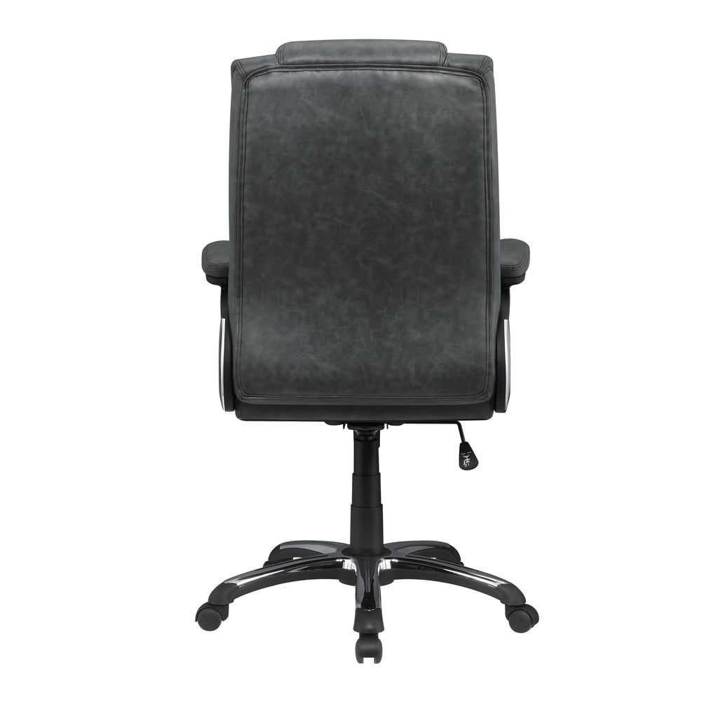 Perfect for a home office, this office chair features plush seating and headrest for working long hours. Wrapped in a supple leatherette, this chair also offers ergonomic design with curved, padded armrests. Get around the office easily with five chrome caster wheels. Included with this office chair is an adjustable lever to raise to your existing desk height. Place this office chair in a modern or contemporary home office for ultimate comfort and support.