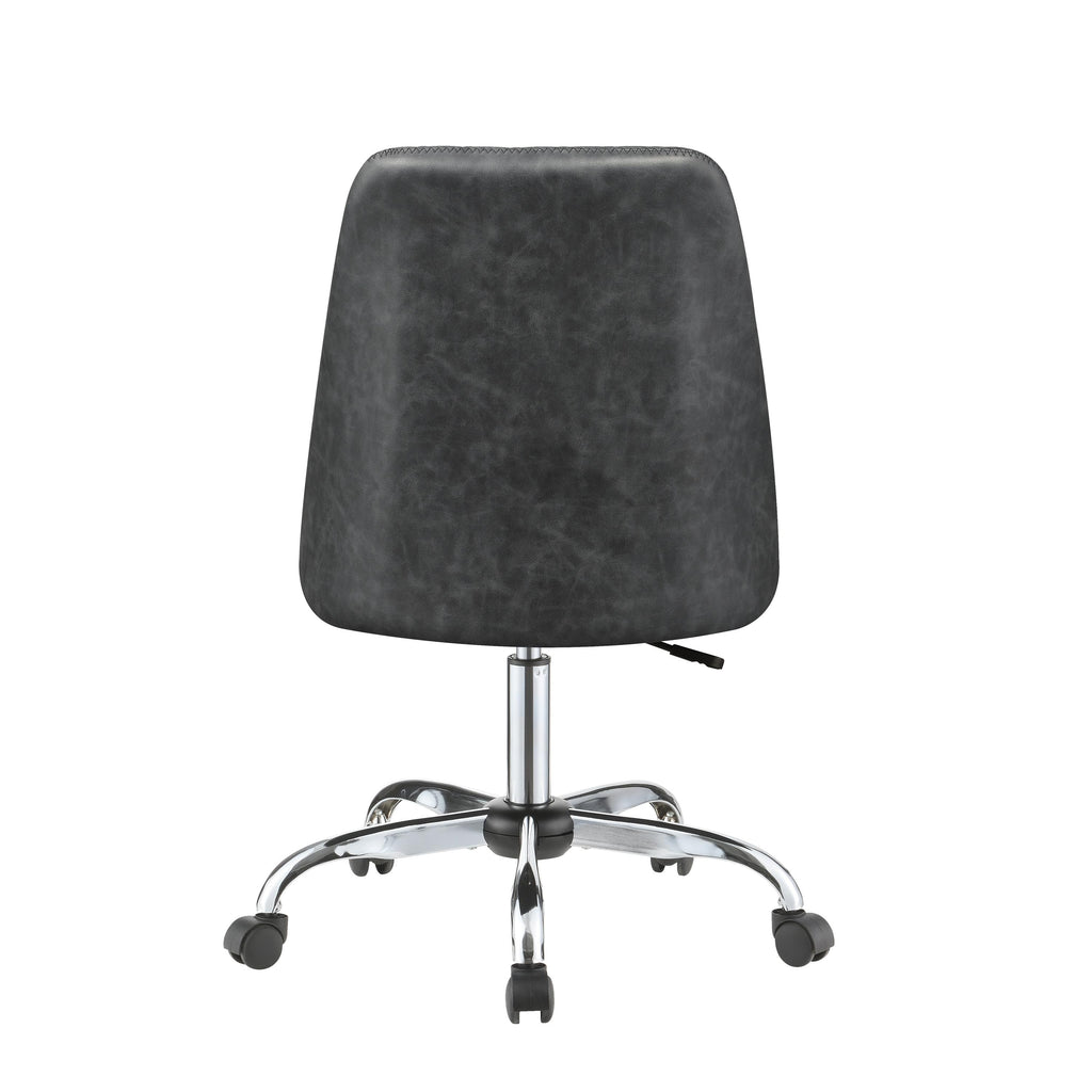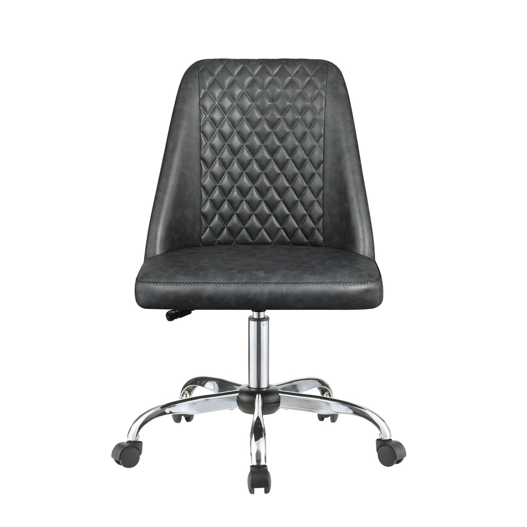 Pull this contemporary accent chair up to a workstation in your home office. Wrapped in a supple leatherette, this office chair features a bucket style seat with a diamond tufted backrest and a smooth cushion. Capable of getting around the office, this chair also features five caster wheels attached to a shiny chrome base. Highly functional, this office chair can also be raised and lowered to suit your existing desk height. Place this stylish chair in a modern home office for comfort and versatility.