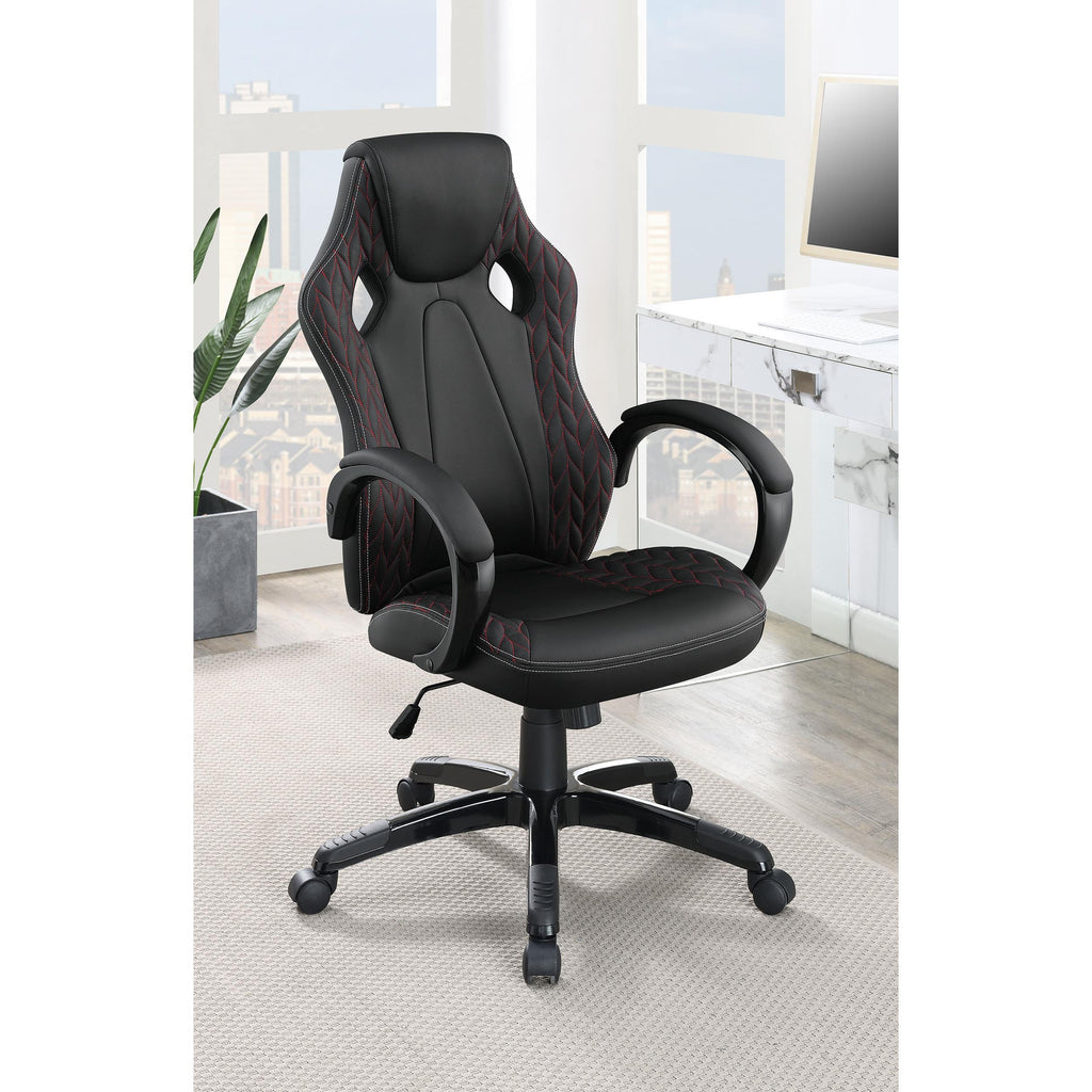 Perfect for a modern home office, this contemporary office chair is wrapped in a black leatherette that offers a bold statement piece. Accenting the black leatherette is a botanical-inspired herringbone pattern with a red stitching details, giving a subtle pop of color. Rounded padded arms provide a place to rest your elbows, while a padded headrest and seat offer long-lasting all-day support. Mounted to a rolling base with five wheels, this mobile office chair easily glides throughout the office space to retrieve items and more. In addition, this office chair can be adjusted, lifted to fit your preferable desk height.