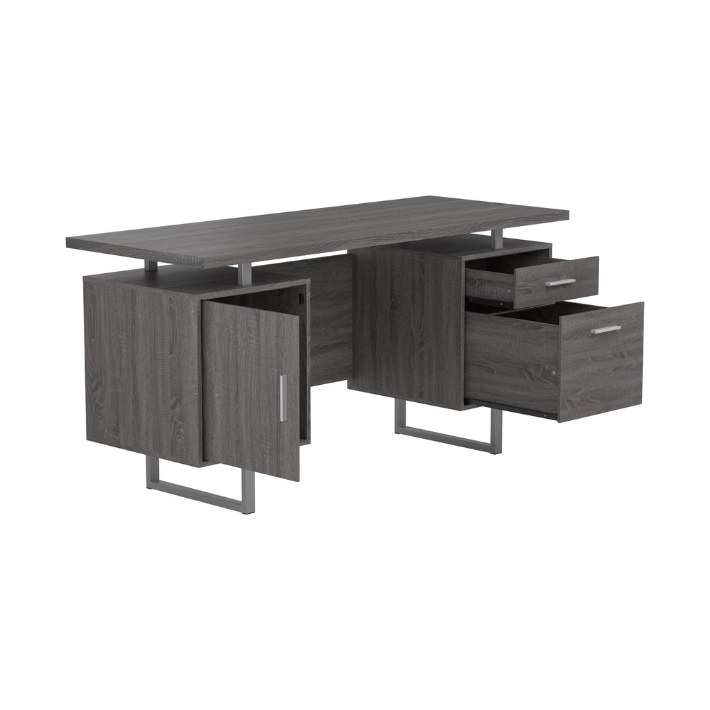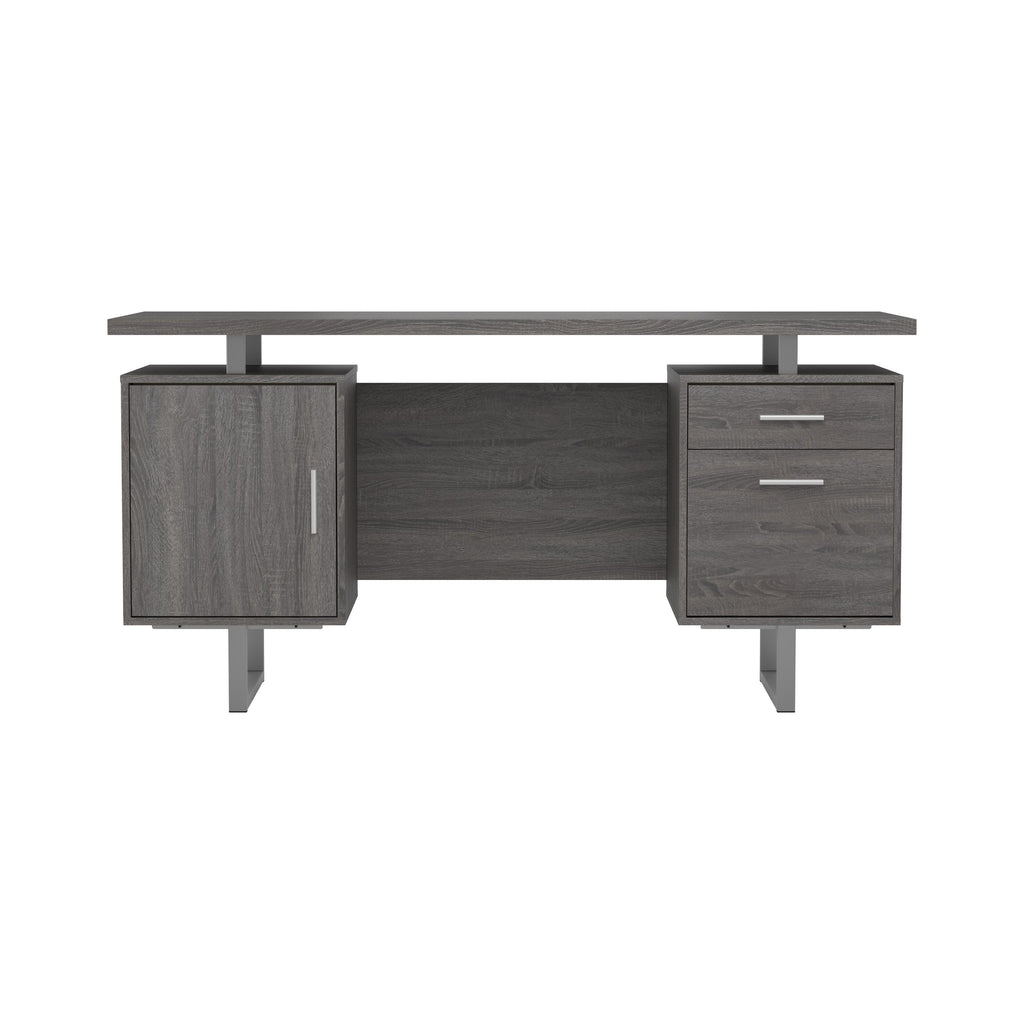 Chic and modern, this wooden writing desk creates a gorgeous focal point in any home office. Sleek lines of silver finish metal create a sturdy foundation for its stylish design. A rectangular, floating tabletop adds visual intrigue to its clean silhouette. A storage cabinet, drawer, and file cabinet keep office essentials organized with ease. Available in your choice of attractive colors, there's an elegant option to effortlessly match with your space.