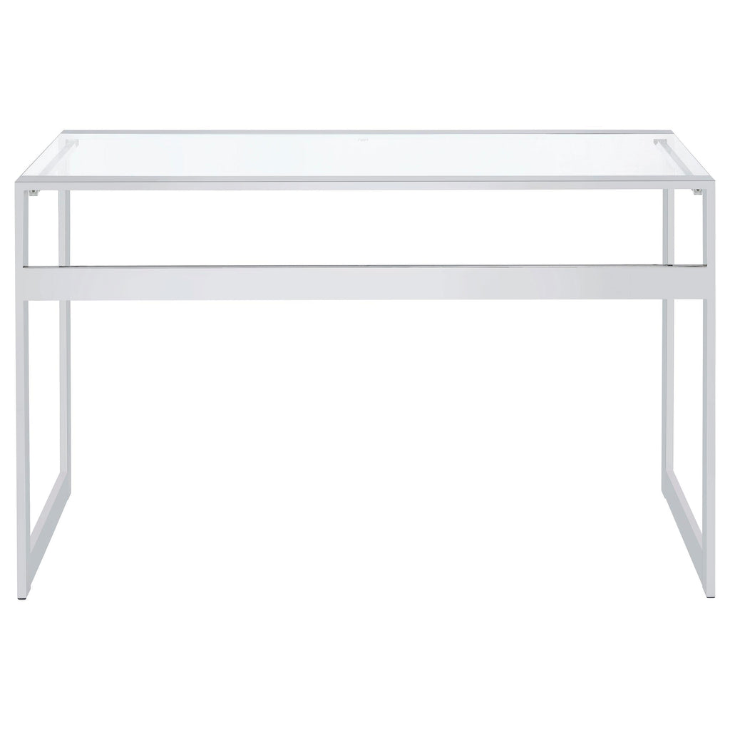 It's a writing desk that's perfect not only for writing, but also for designing ad brainstorming. Lay out the design plans or concepts across its spacious, clear tempered glass top. With its steel construction, it'll stand up to those all-night sessions of hashing out the perfect concept that'll change the world. Finished in chrome, the desk has the modern styling that inspires. This desk is the ideal piece in a contemporary commercial or home office.