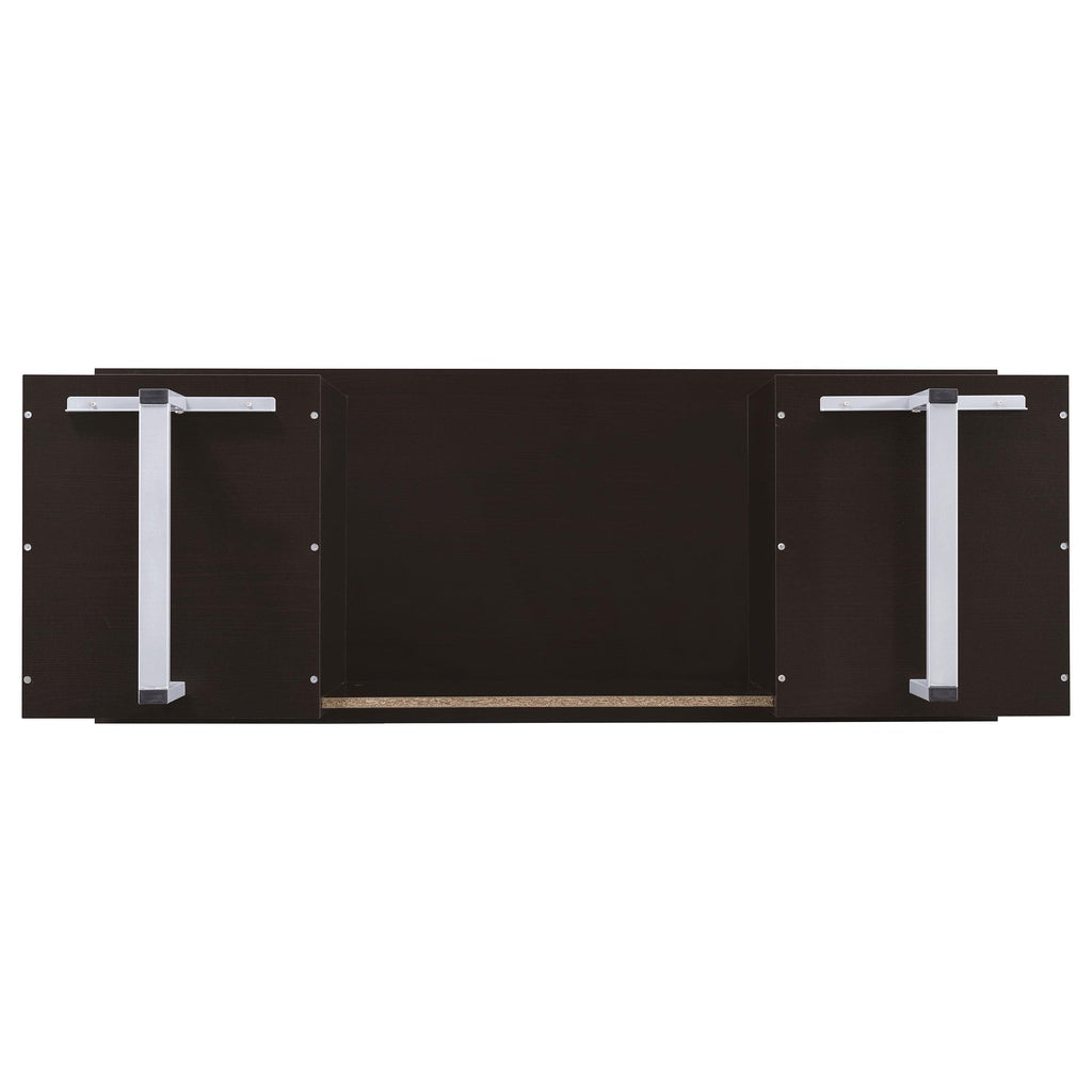 Enjoy an intriguing architectural design in this office desk. A floating top creates a visually enticing effect and a completely different look. Finished in cappuccino, it flatters surrounding decor and delivers a dramatic touch. Store essentials in a cabinet and drawer, and use a file cabinet to organize papers. Contrasting silver hardware and steel legs plays up the contemporary flavor of this stylish desk.