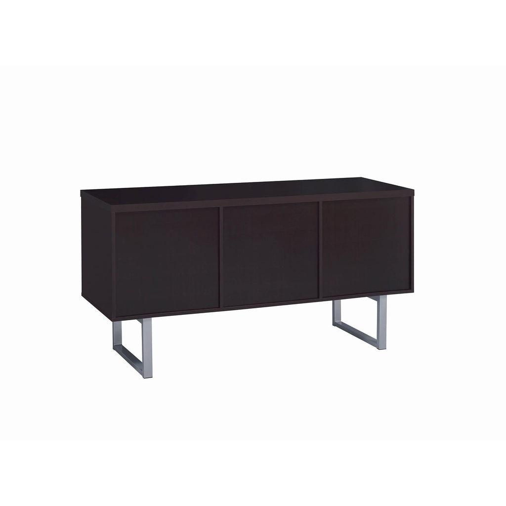 Extend the utility of an office desk with this beautiful credenza. Built with a linear silhouette, its minimalist design is flattering to a contemporary office. Cappuccino brings a dramatic finish. Metal u-shaped legs and hardware add perfect finishing touches. Storage and utility are top-notch with a top drawer, an open shelved compartment. and two file drawers.