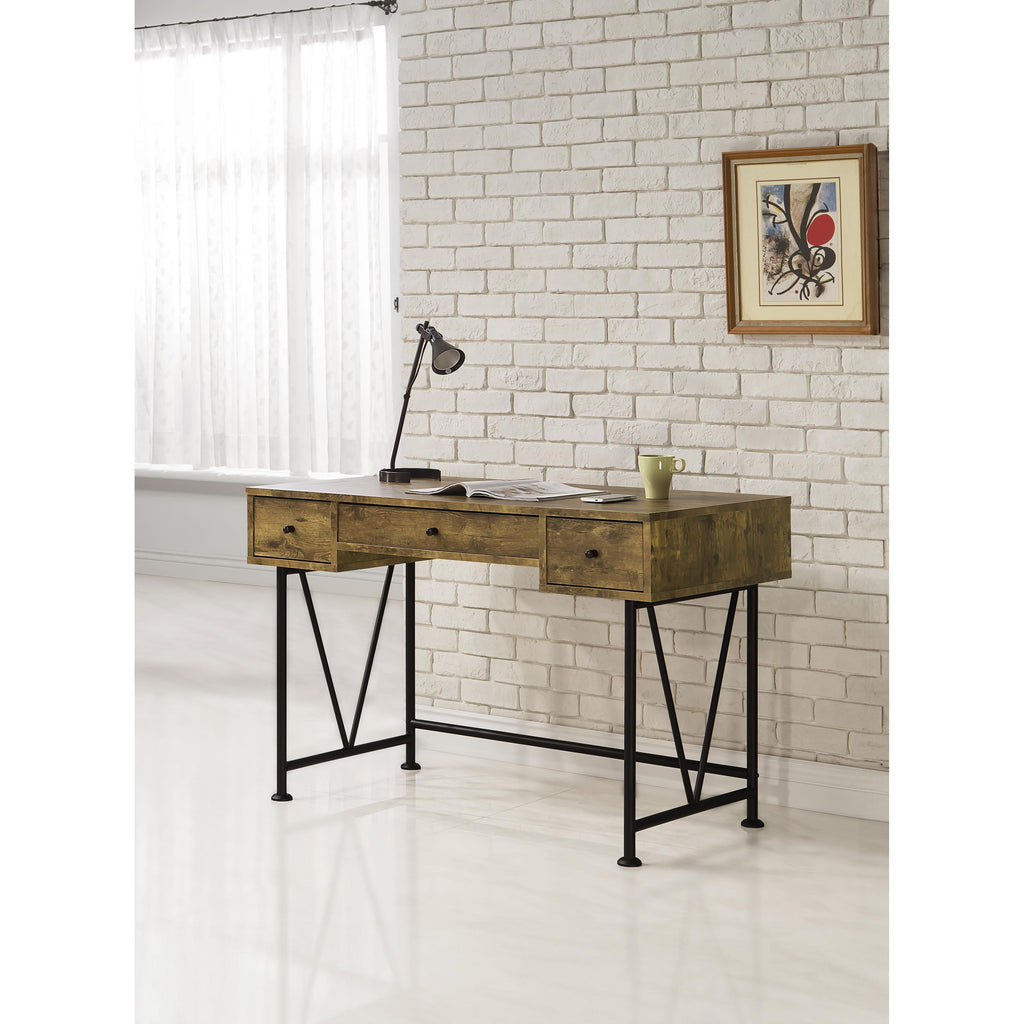 Enjoy an interesting design with earthy ambiance. Ideal for a student's room or small home office, this writing desk lends a hint of industrial style. Lovely antique nutmeg finish over its desk unit blends with a black metal finish steel frame. Geometric accents keep the motif contemporary and stylish. Find room for storage in three drawers with smooth Euro glides.