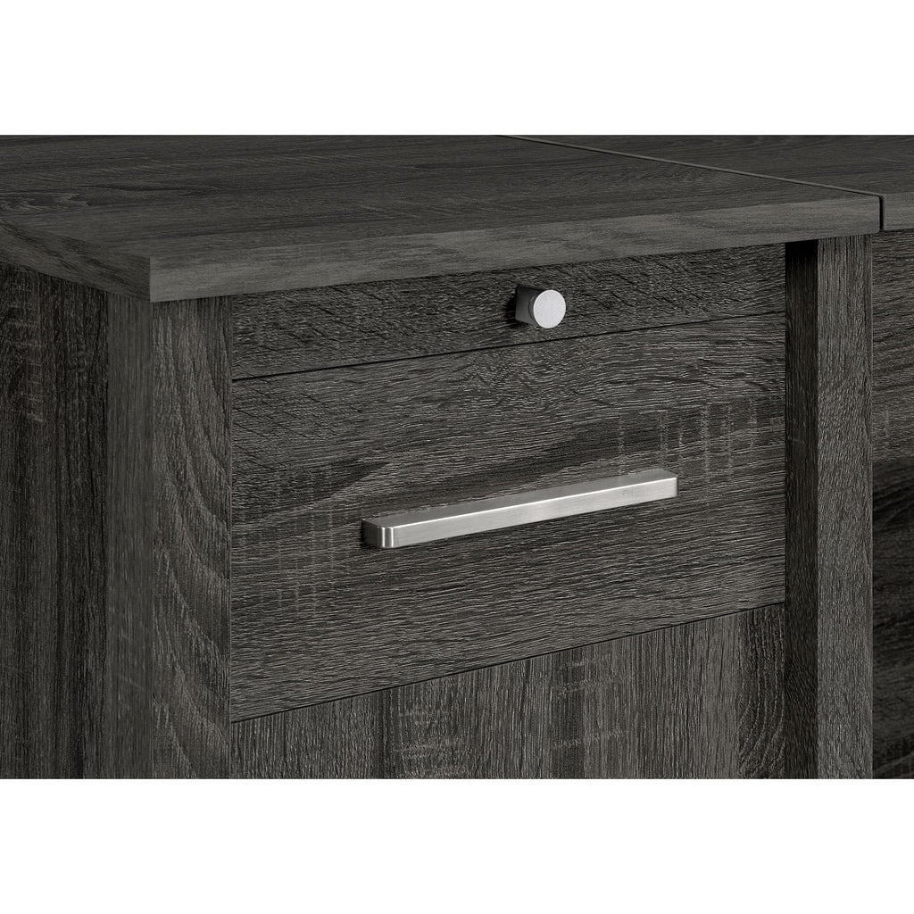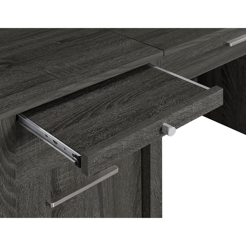 Create the perfect ergonomic home office setup with this contemporary lift top office desk. A smooth surface all around, this contemporary desk features clean lines and plenty of space for work or study. Spacious drawers help organize office files and essentials, each one fastened with a sleek pull in a shiny brushed zinc finish. Need extra writing space or a place to keep coffee nearby? This clever desk features two pull-out trays, one on each side. Extra touches like smooth ball bearing glides and soft-close glides offer modern upgrades.