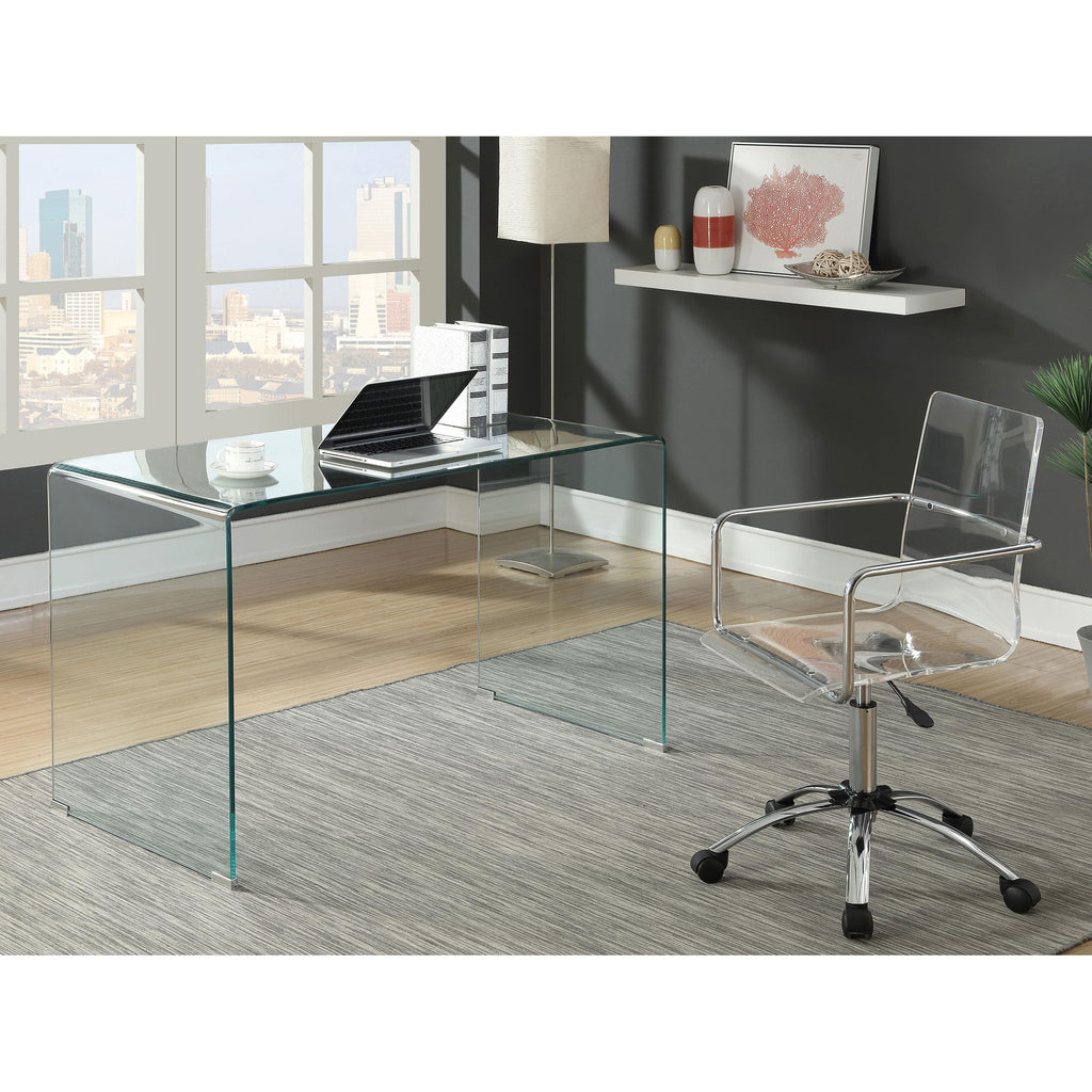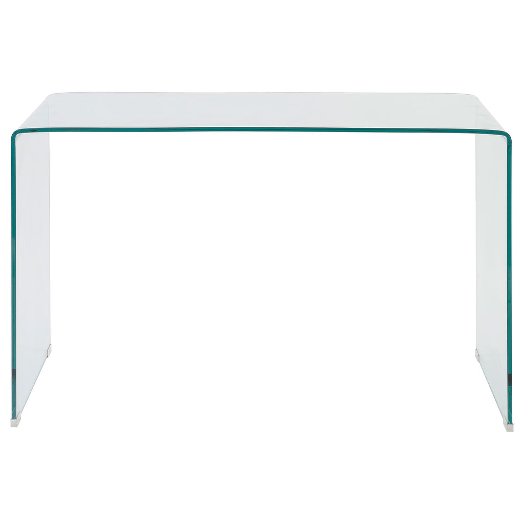Combine modern design and minimalist construction for a writing desk that's sure to please. It features a clear tempered bent glass as the table top and solid-piece legs/stand. Chromed steel floor protectors offer practicality and stability as well as a touch of lustrous panache. Table top is large enough to accommodate a widescreen monitor and table lamp. A perfect writing desk for writing with a city view or overlooking a countryside landscape.