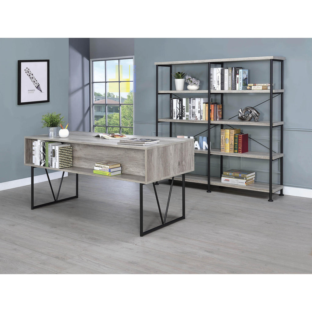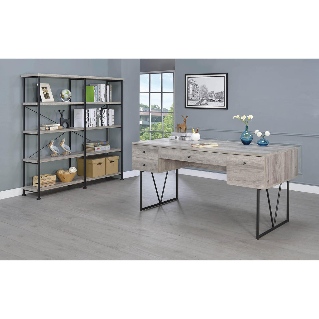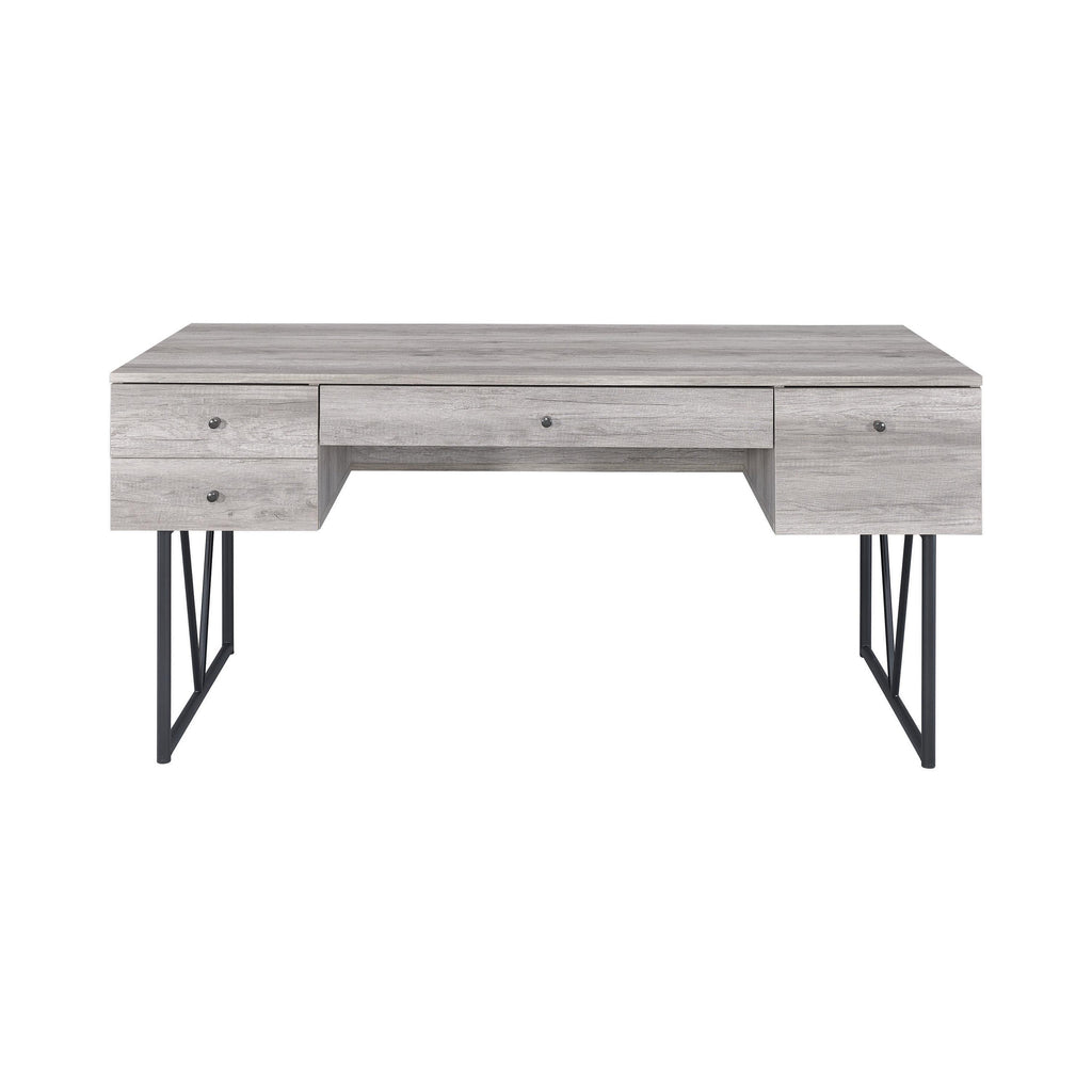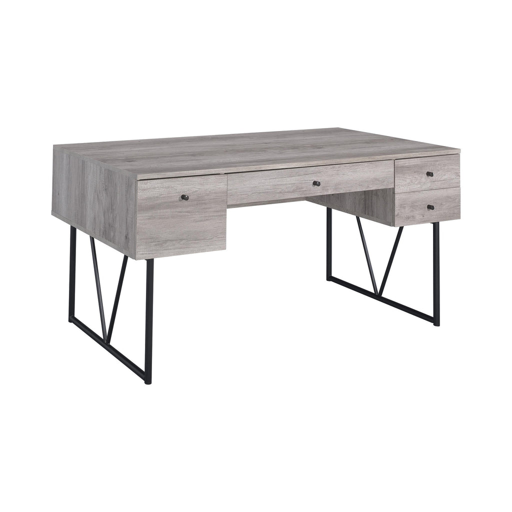 This handsome writing desk combines minimalist design with industrial function. It's fashioned with four drawers complete with full extension glides for convenient storage capacity. The table top has wood grain accents that evoke character and warmth as well as space for all necessary work materials. The metal base and legs have a black finish that's a magnificent contrast to the grey driftwood design. Up your productivity with this desk that's ideal for any office space.