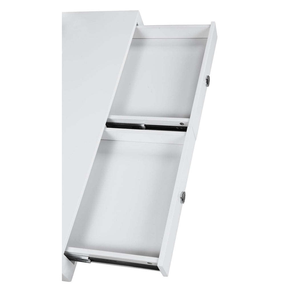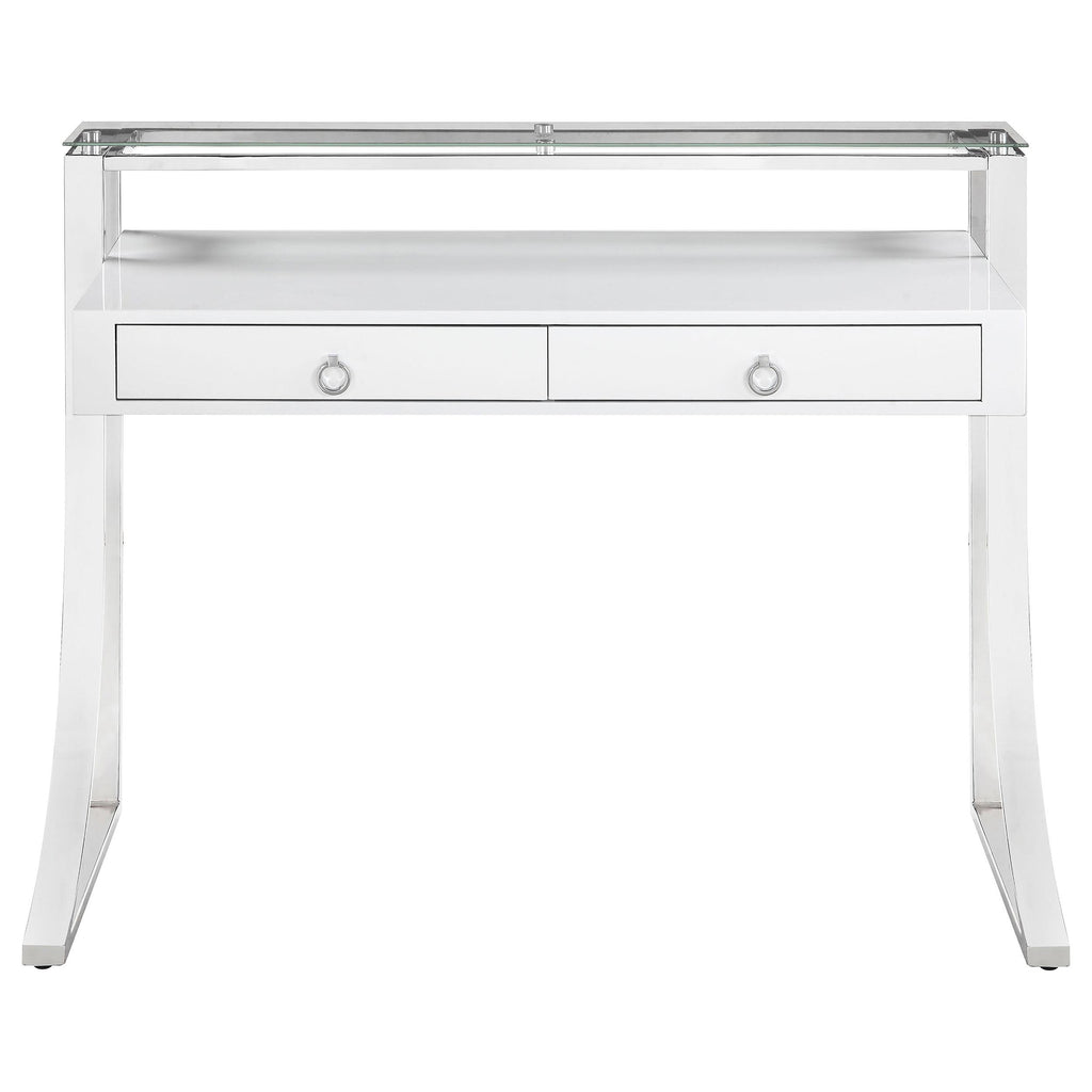 Add an edge of contemporary flair to any living space. This sleek, stylish writing desk exudes glamorous appeal. Its eye-catching frame is expertly crafted with a gracefully curved silhouette. Its gorgeous, glossy white surface blends appealingly with its shining chrome legs. Complete with two felt-lined drawers with full extension glides, this desk enhances any home office with convenience and modern style.