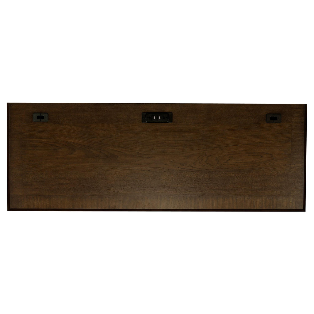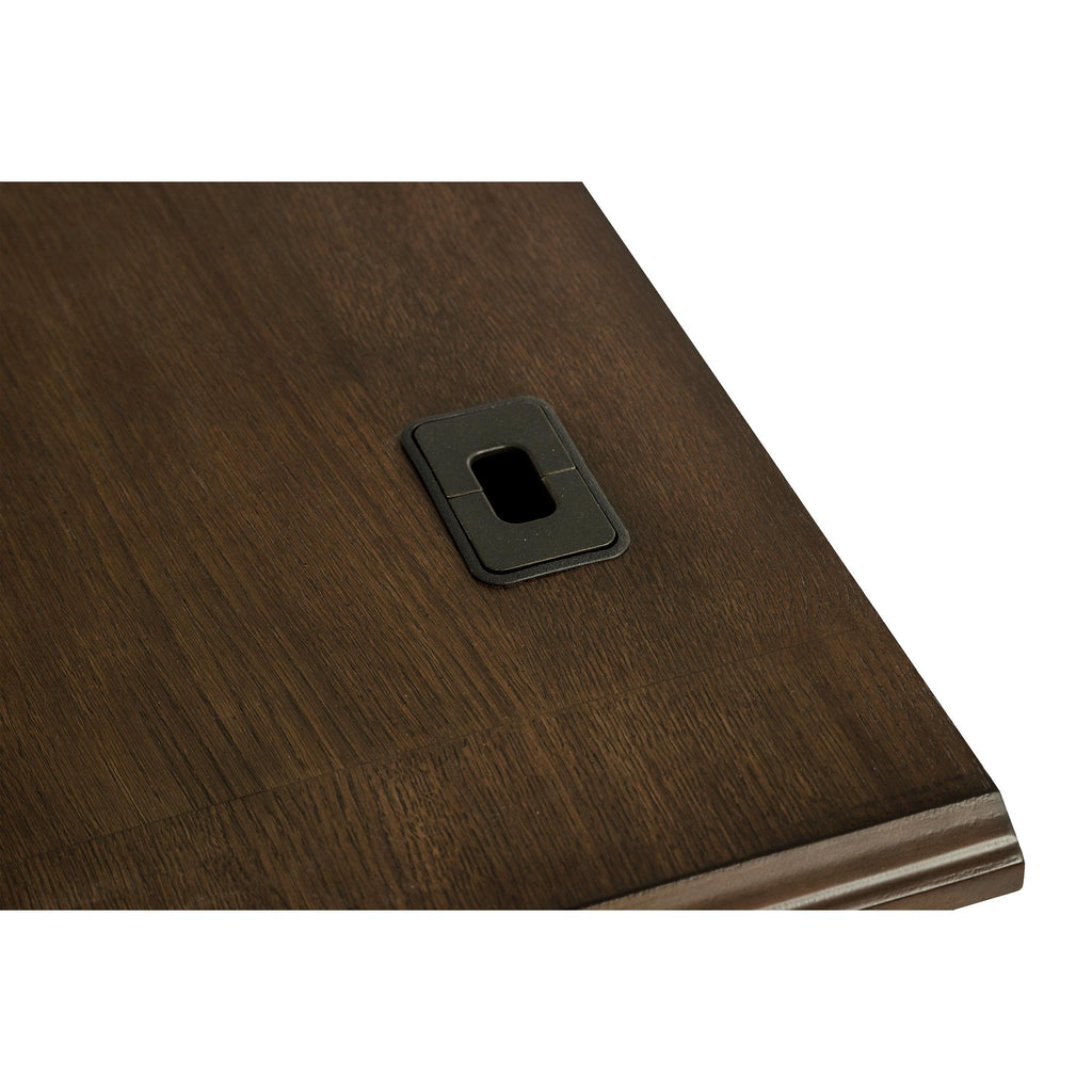 Get creative in how you use and style this attractive Credenza. Its warm burnished oak finish enhances its frame while supported on bracket style legs. Plenty of storage is found within its felt-lined top drawers. Removable dividers allow for extra organization with this piece. Keep your valuables safe and sound within the two lower cabinets that lock with an included key.
